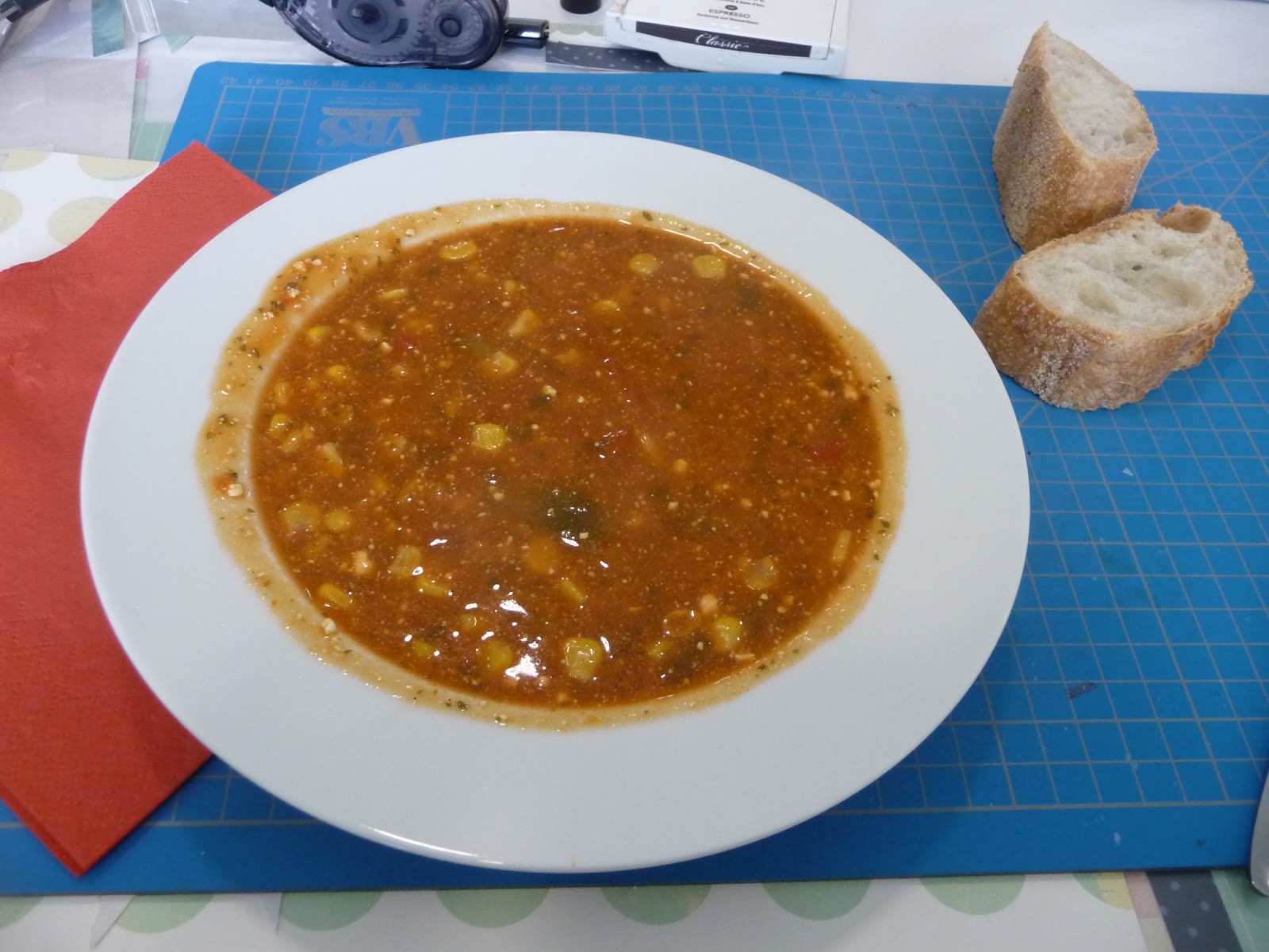 Und dann gab es natürlich lecker Mittagessen:Paprika-Mais Suppe+Baguette,als Nachspeise eine Quarkspeise mit Beeren und ein kleines Blätterteiggebäck.