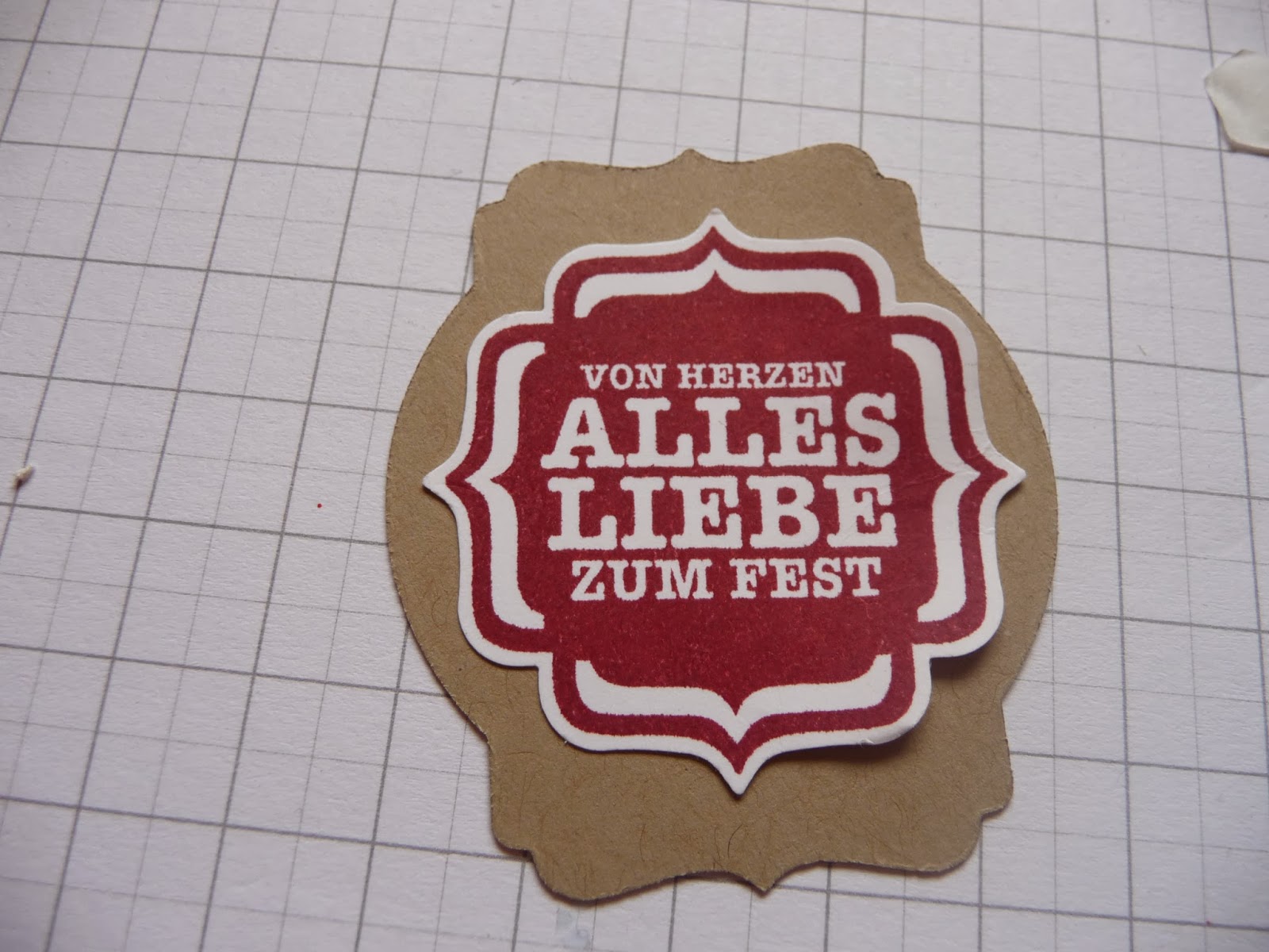 Auf die andere schmallere Seite wird nun ein größeres Dekoelement geklebt,unter der die andere Kartenseite festgeklemmt wird.Ich habe dafür das Stempelset “Tüpfelchen auf dem Geschenk” genommen und mit der Stanze “Edlees Etikett” ausgestanzt.Dann habe ich aus FK Savanne mit dem Framelit “Etikett-Kunst” den Rahmen ausgestanzt und darunter geklebt.
