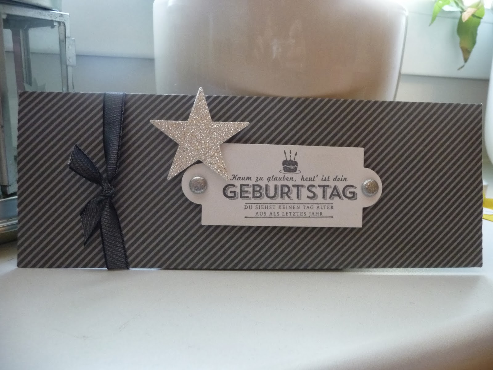 Ich zeige euch das verpackte Geschenk an meinen Mann.Er hat Fußballeinttrittskarten bekommen,die mußten doch nett verpackt werden.Also das vielseitige Punchboard genommen,darauf nachgeschaut welche Größe Papier ich brauche und wo ich falzen muß,daß steht nämlich alles drauf,und eine passenden Umschlag gewerkelt.Diesen noch etwas verziert.