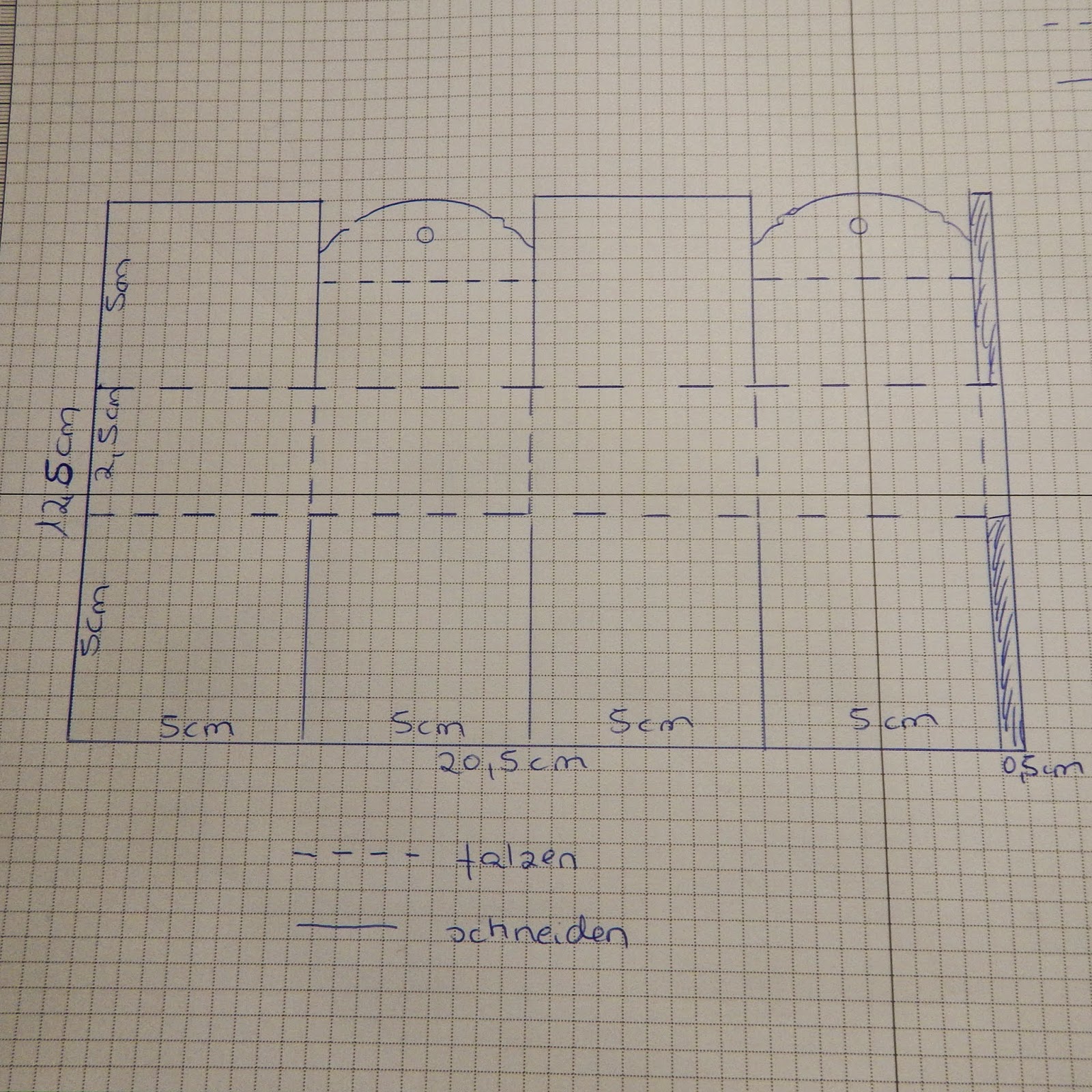 Dann falzt ihr an der langen Seite bei 5/10/15/20cm,an der kurzen Seite bei 5/7,5cm .