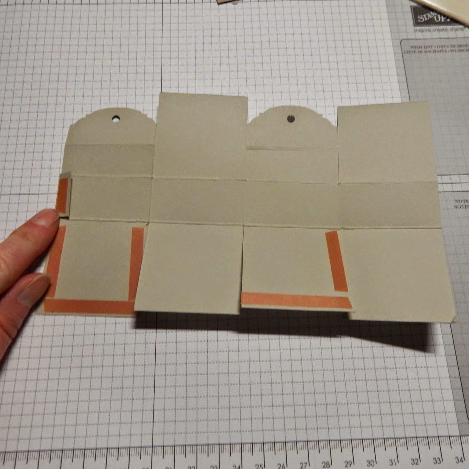 Dann werden die Teile,wie unten auf dem Foto,mit doppelseitige Klebeband,oder auch Tombow Flüssigkleber,versehen und die Schachtel zusammengeklebt.