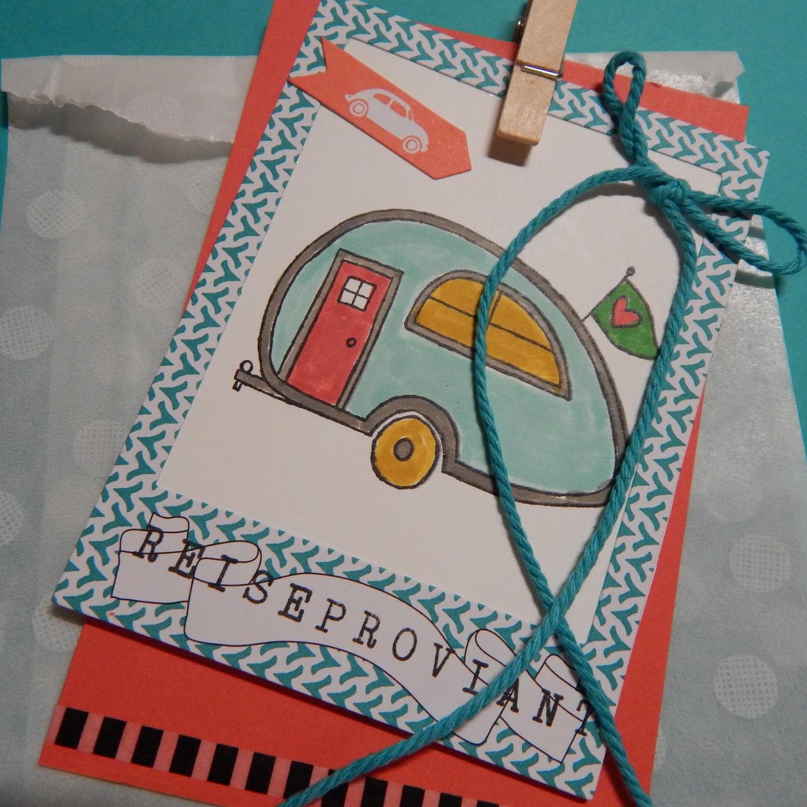 Als ich das Set anschaute,mußte ich bei dem Wohnwagenmotiv an meine Demofreundin Carry denken.Sie besitzt so eine kleine Hutschfidel und liebt es damit die Welt zu entdecken.nd das fröhlich bunte passt auch gennau auf sie.Was könnt ich Carry also mit auf die Reise geben?Natürlich eine süße Verpackung mit Reiseproviant.Momentan wartet die Verpackung noch auf Befüllung.