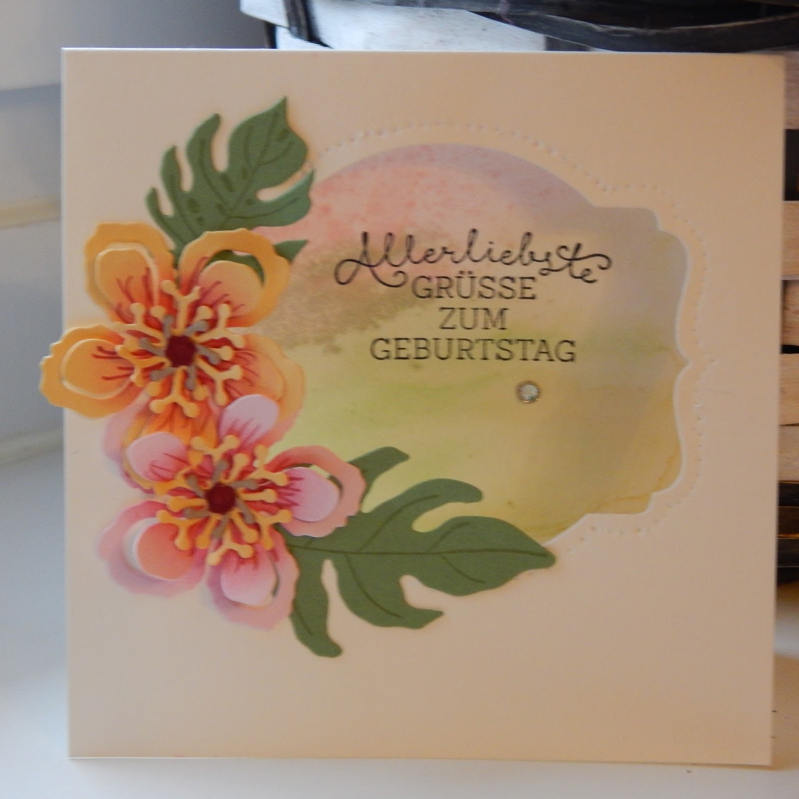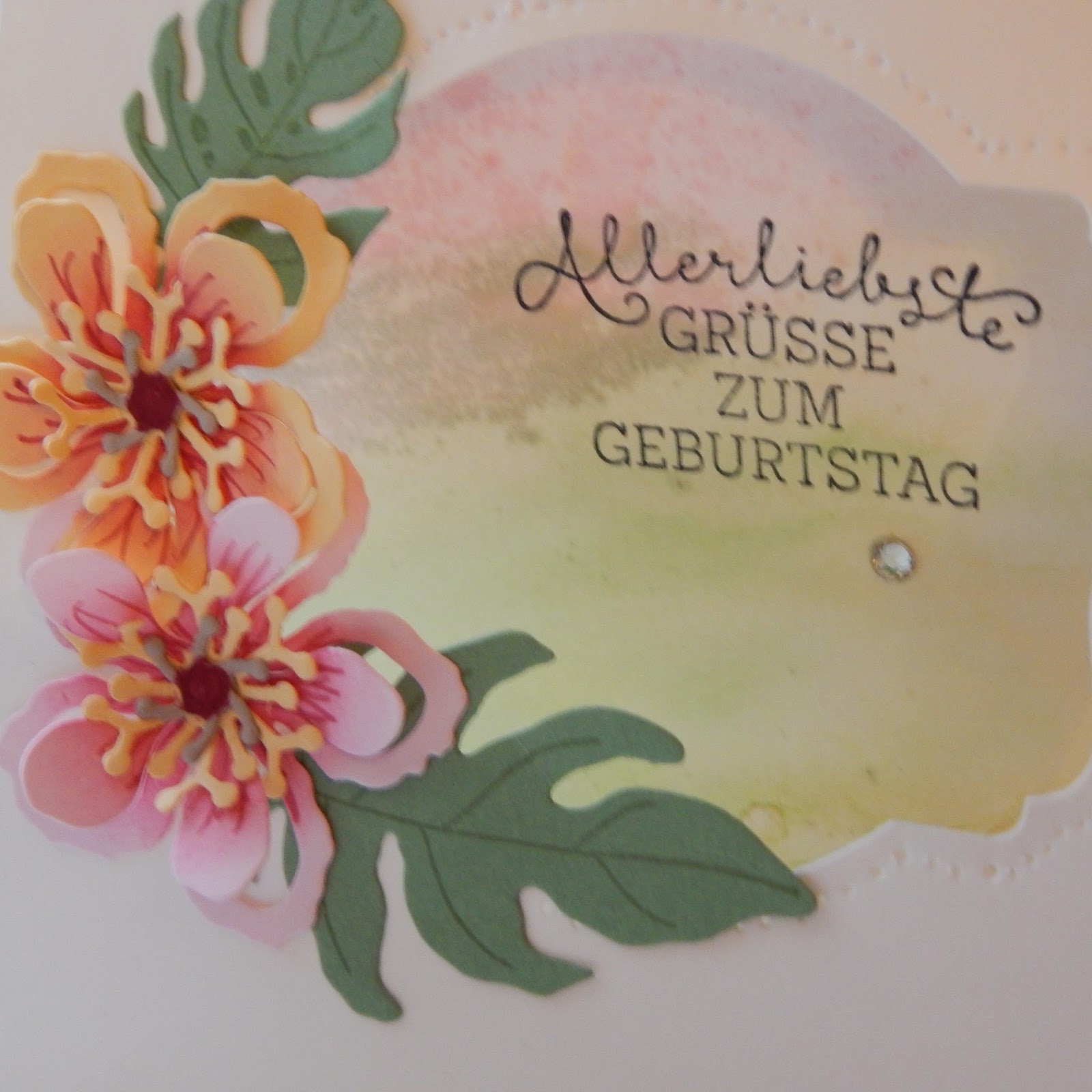Ich möchte dir eine Karte zeigen, gestaltet mit dem wunderbaren Blütenset “Botanical Blooms”. Dazu gibt es passende Stanzen für die BigShot.
