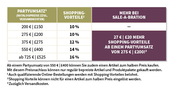 Richte als Gastgeberin eine Party aus und bei einem Mindestumsatz von mindesten 275€ und bekomm 27€ mehr Shoppingvorteile, zusätzlich zu den regulären Shoppingvorteilen!