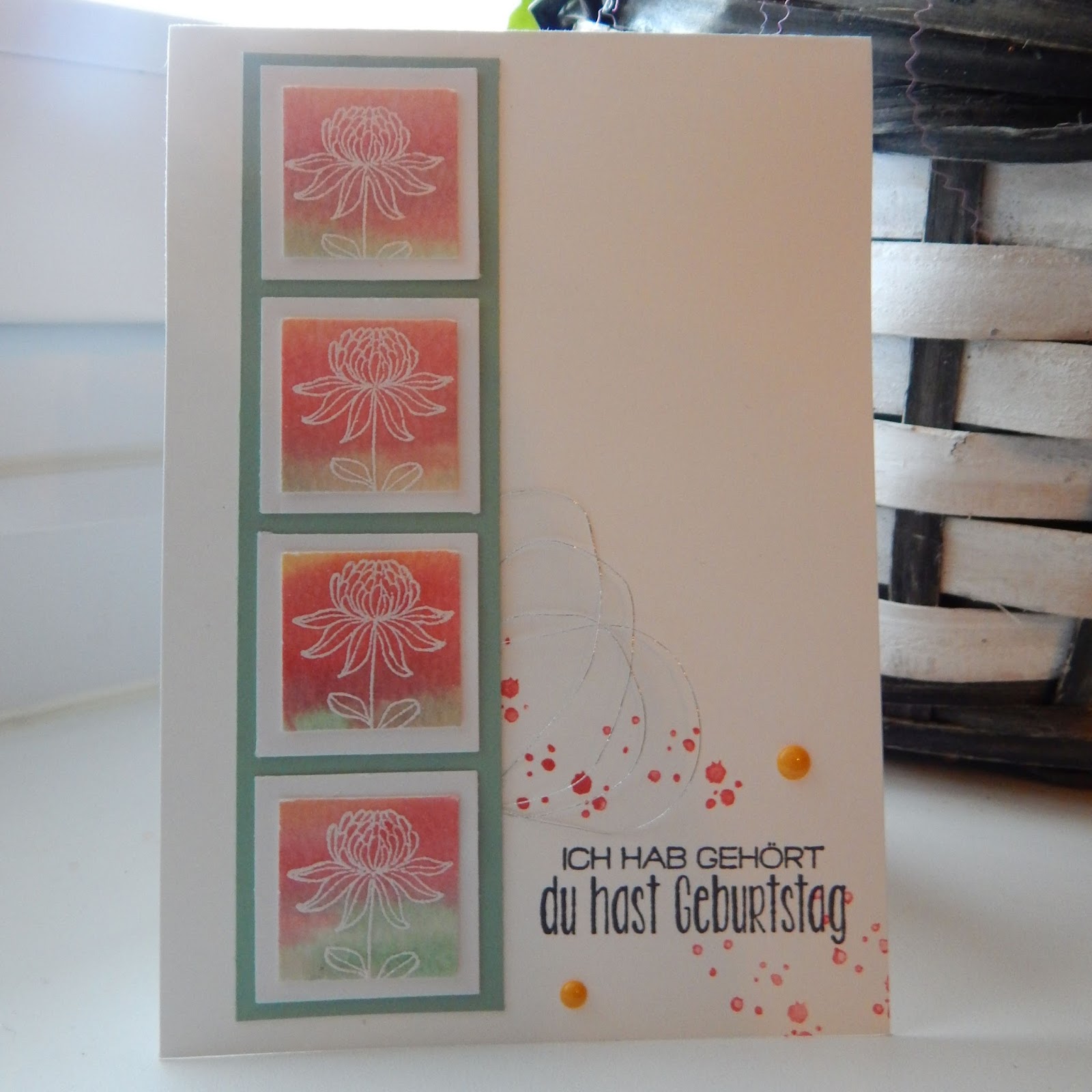 Im Moment bin ich voll bei der Auarelltechnik. Das macht richtig Spaß! Soviele Möglichkeiten und keine Karte sieht wie die Andere aus. Auch mit den neuen Produkten wunderbar zu kombinieren .