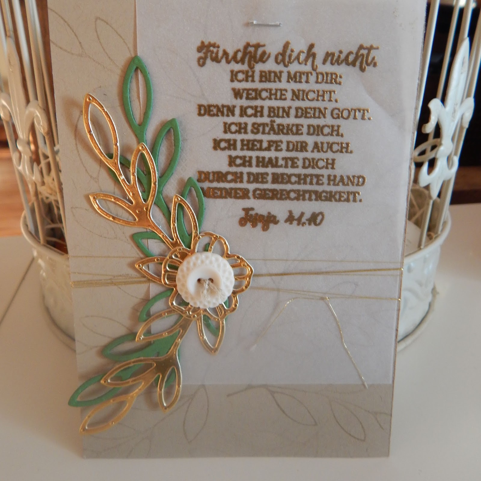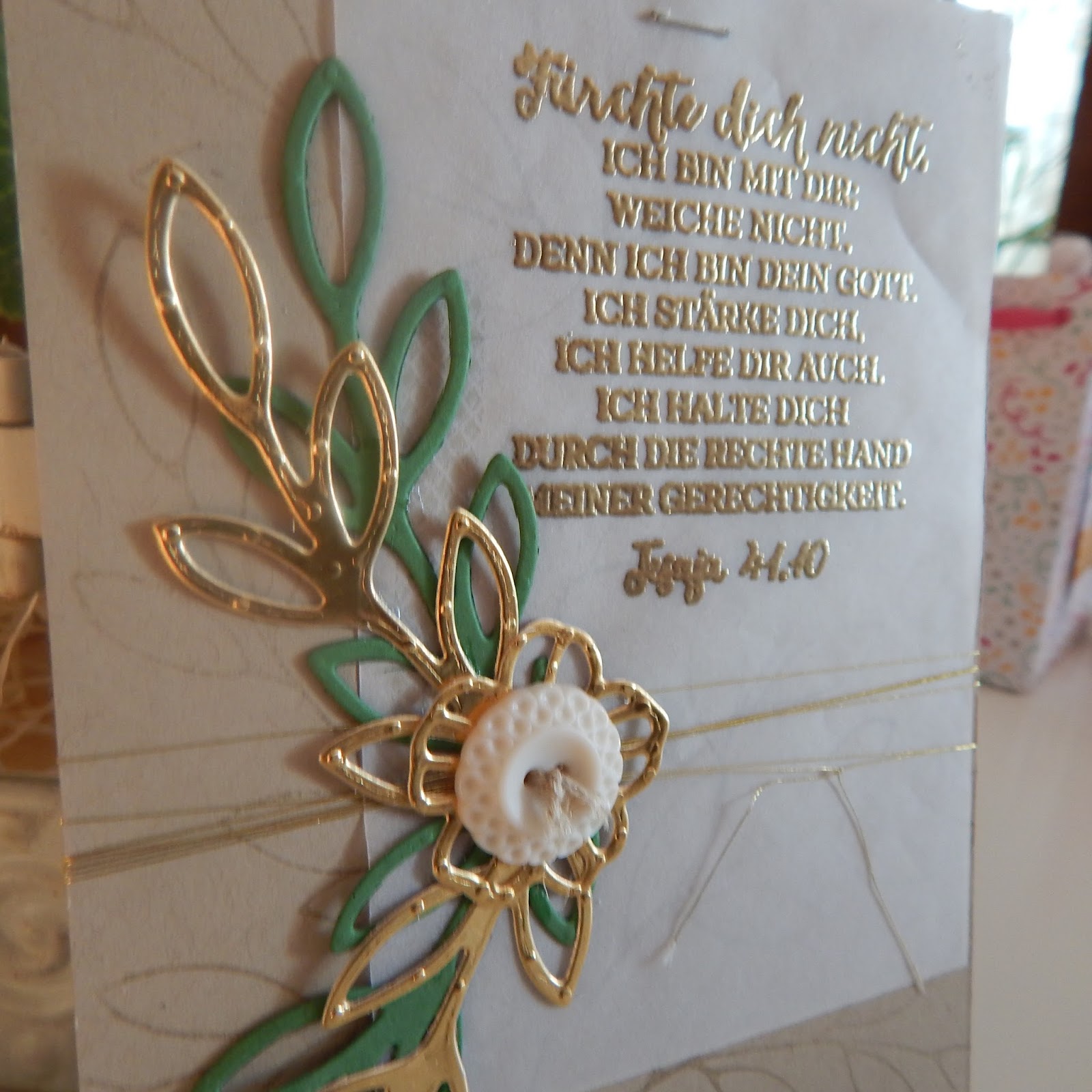 Die Blätter sind mit den Thinlits Rosengarten ausgestanzt und der Spruch In Gold embosst, aus dem Set “Rosenzauber”.