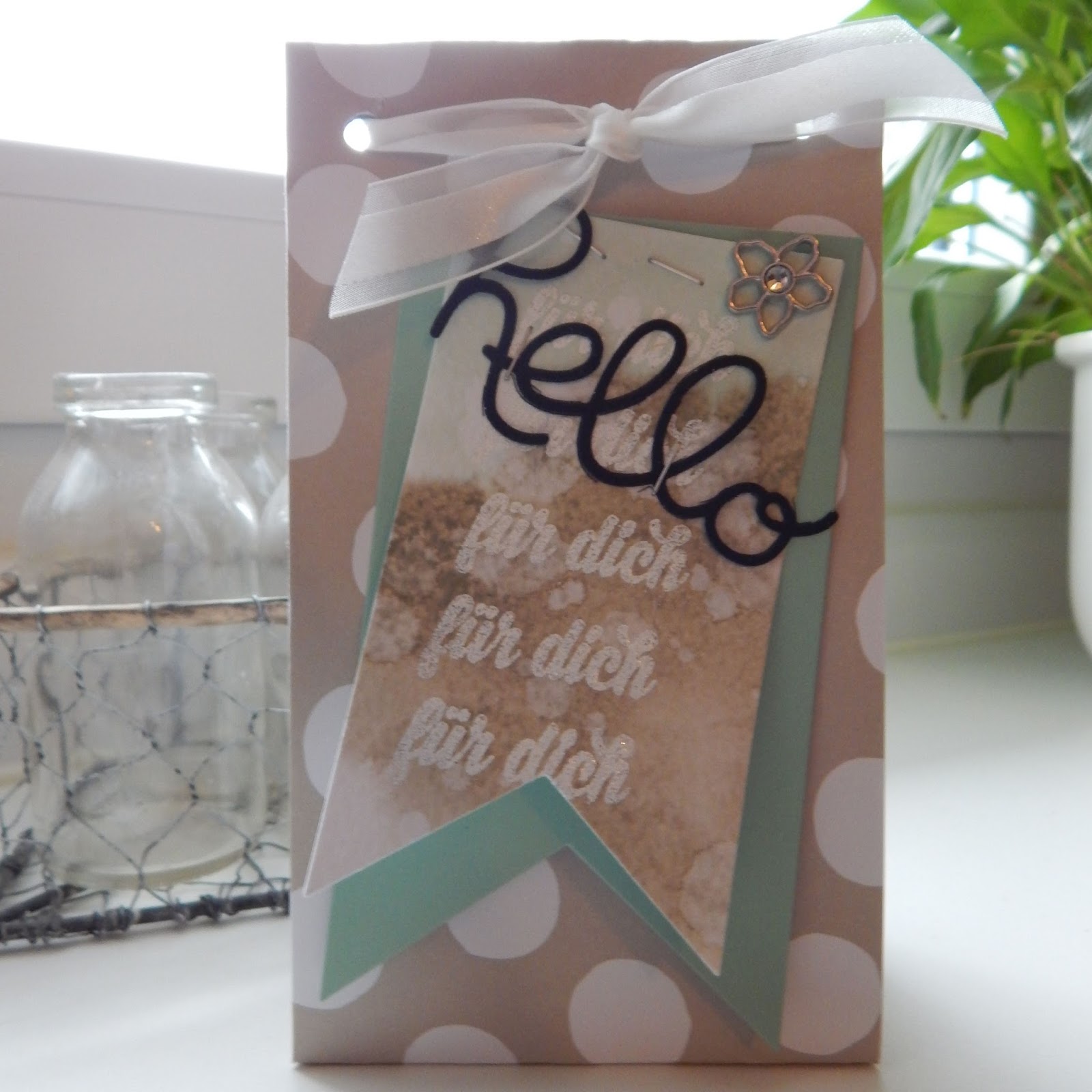 Ein Geschenkset in zarten Tönen, hauptsächlich Saharasand und Minzmakrone. Die Verpackung ist mit dem Falzbrett für Geschenktüten gewerkelt und den Banner habe ich mit den Framelits Banner ausgestanzt.