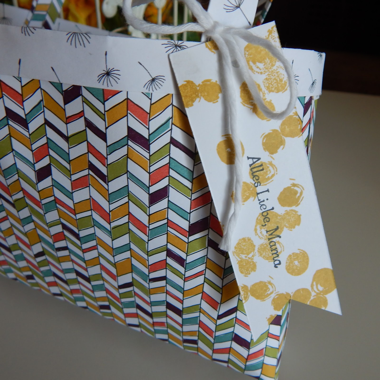 Das Set habe ich schon vor einiger Zeit gewerkelt,mit einem neuen Stempelset und Produkten, die uns verlassen und dem Designpapier aus der ale- a-bration. Es besteht aus einer Karte und einer Tasche, um für Mama etwas Nettes einzupacken.