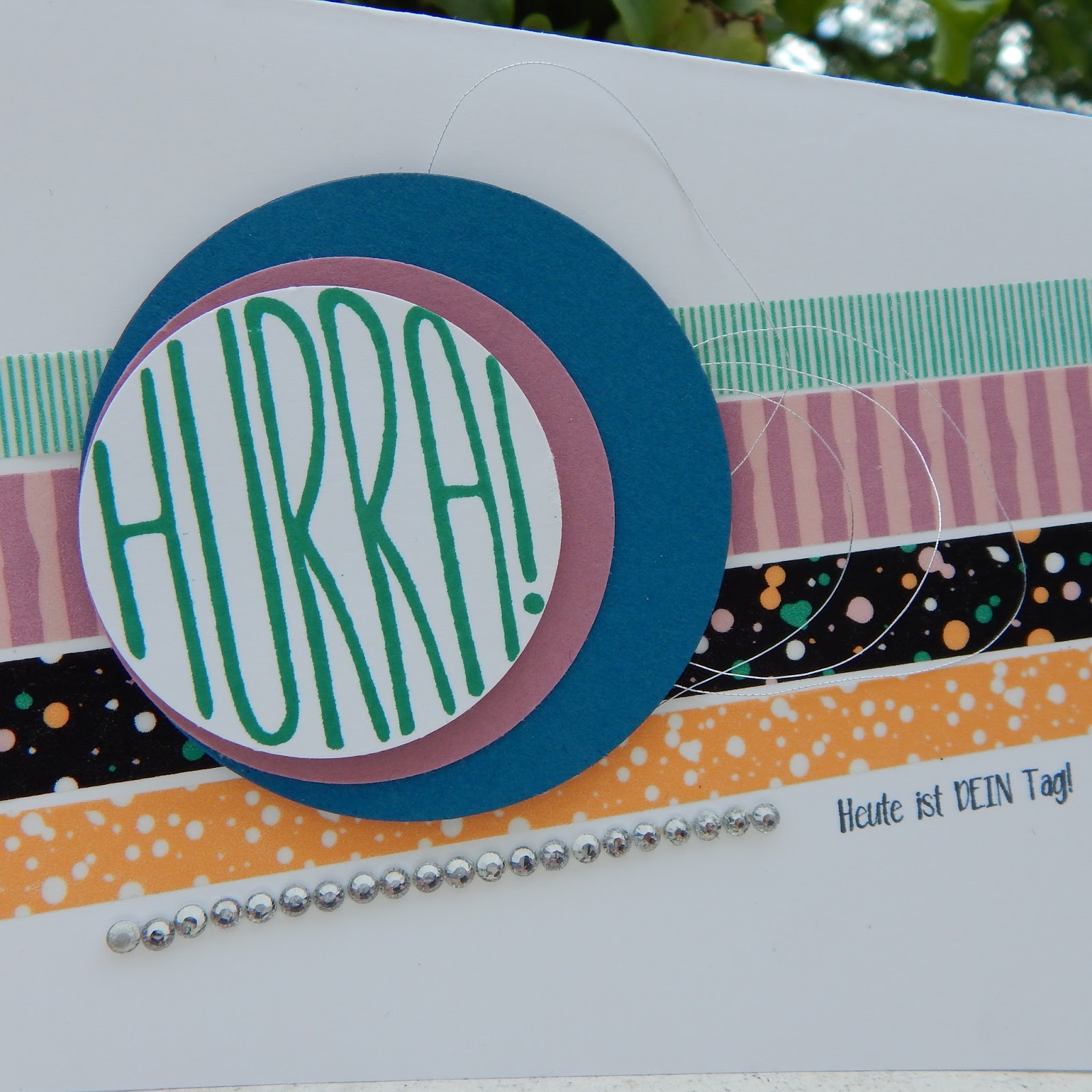 Also habe ich mir neues Washitape, Stempelset und Kreisstanze geschnappt und Ratz Fatz diese Karte gewerkelt.