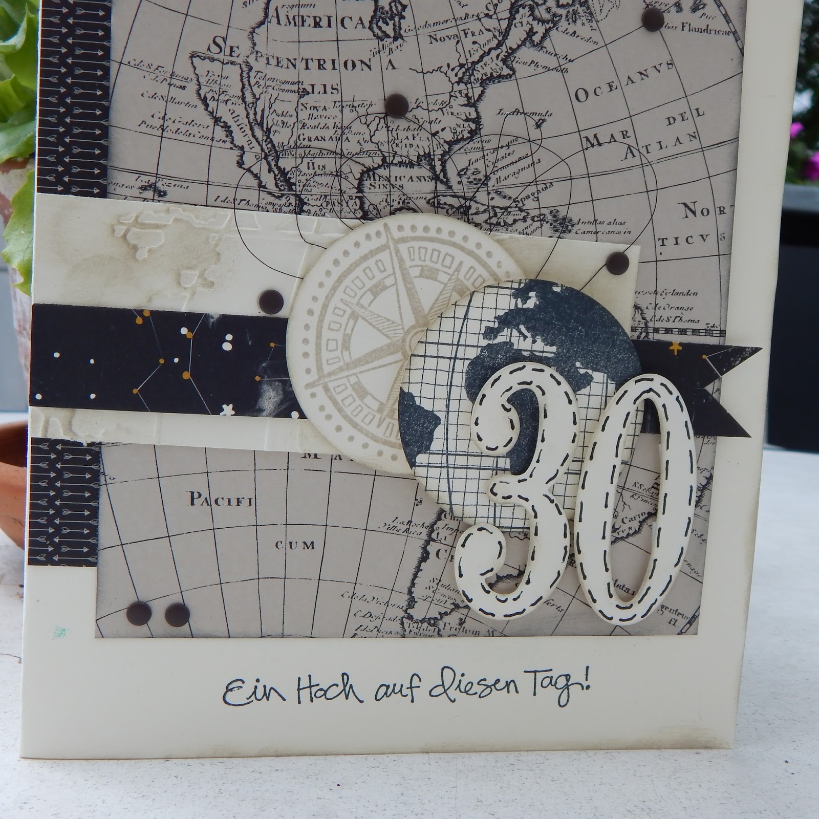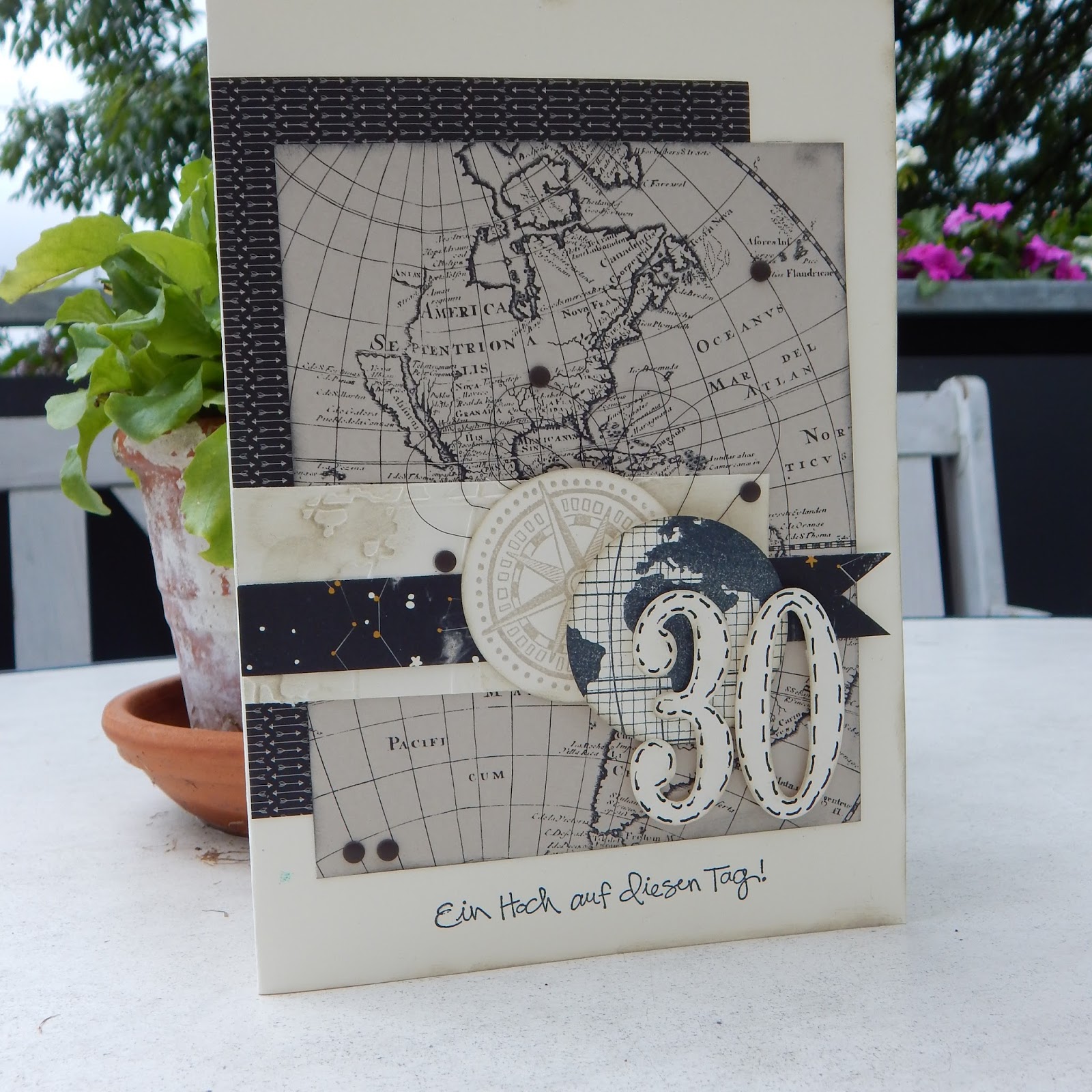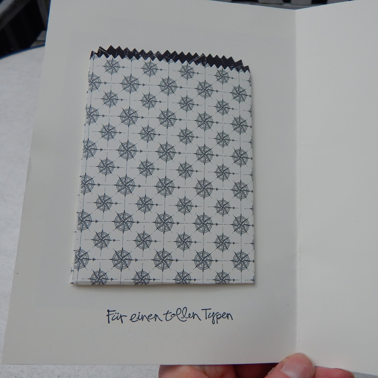 Selbsverständlich habe ich zu diesem Anlass eine Karte gewerkelt. In DIN5 damit alle Platz haben zum unterschreiben und ein Geldfach. Benutzt habe ich das Designpaier aus dem Frühlingskatalog “Weite Welt” und das Stempelset “Liebe ohne Grenzen”. Wer sich diese schönen Produkte erworben hat, bekommt jetzt noch mal eine kleine Idee dazu.