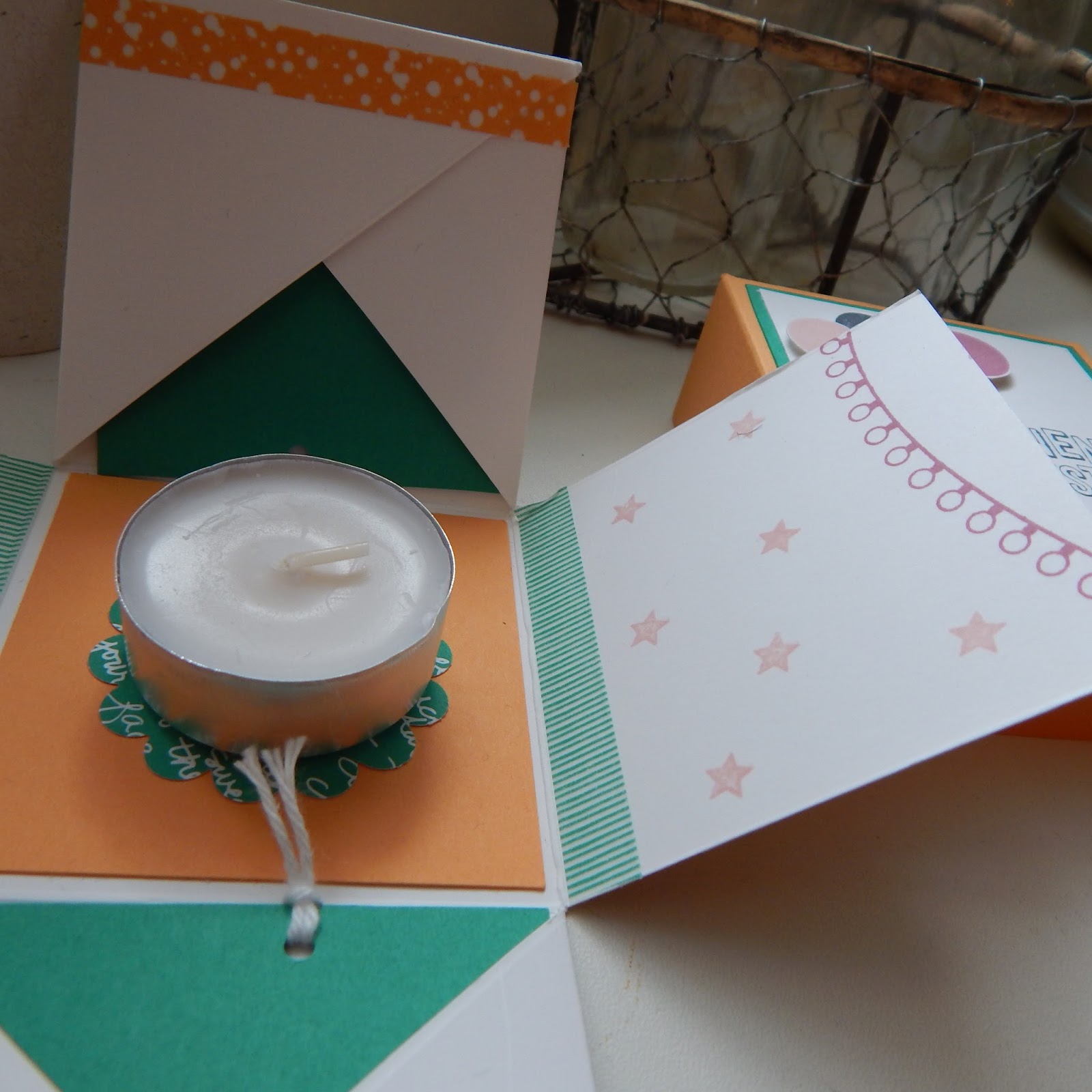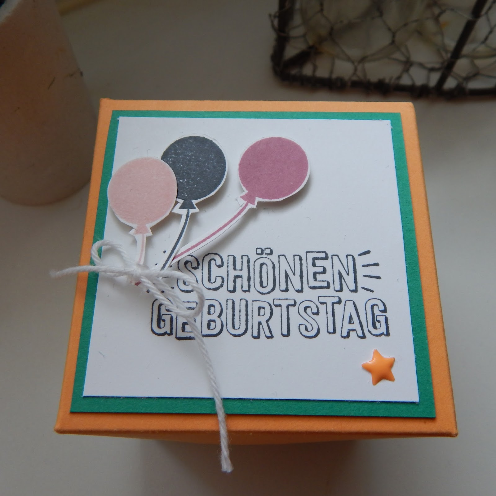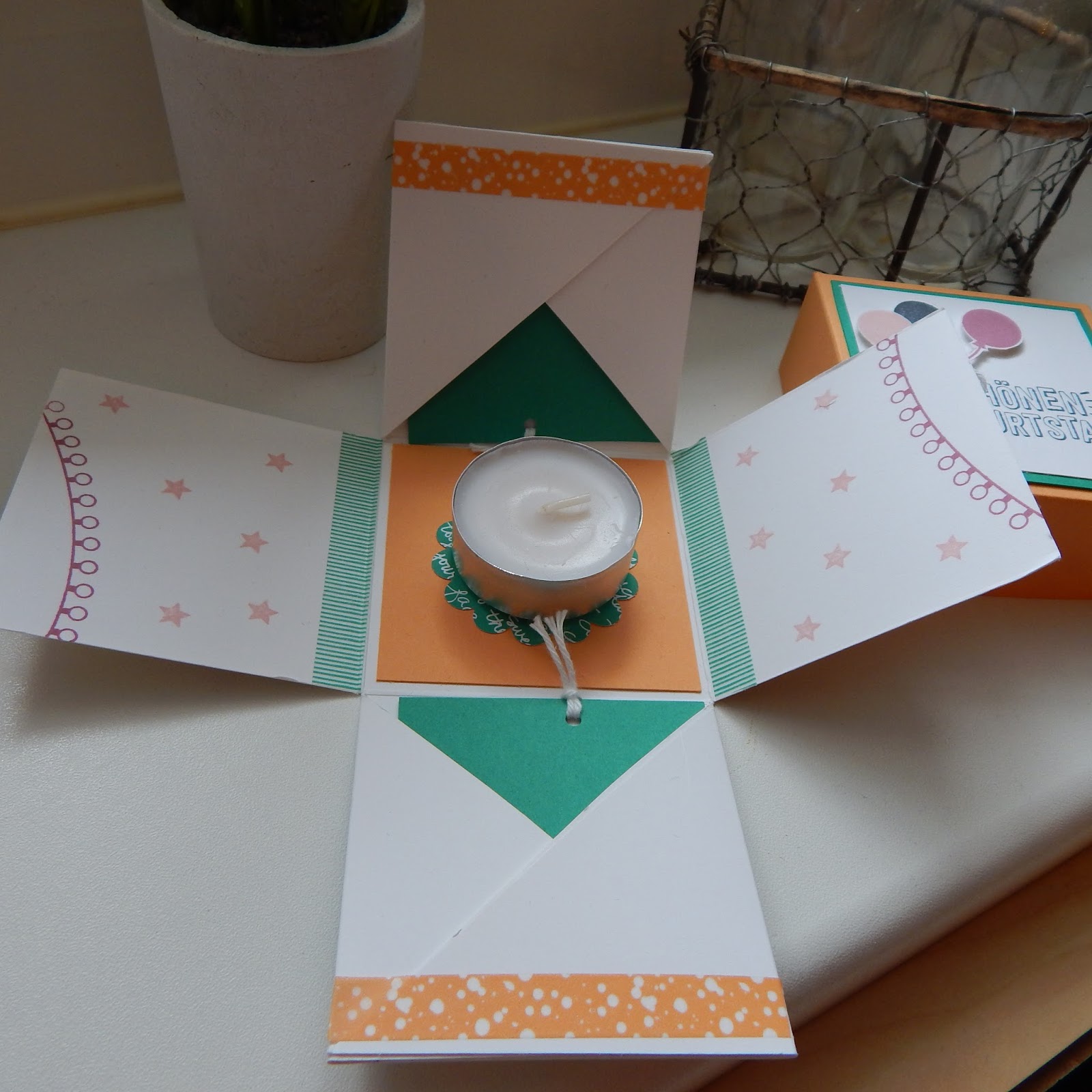 Und für die Explosionsbox habe ich mich ebenfalls an die neuen Farben gehalten und auch nicht zu kompliziert gestaltet. Dabei konnte ich das Designpapier “Kunterbunt” und das Stempelset “Konfetti-Grüße” zeigen.