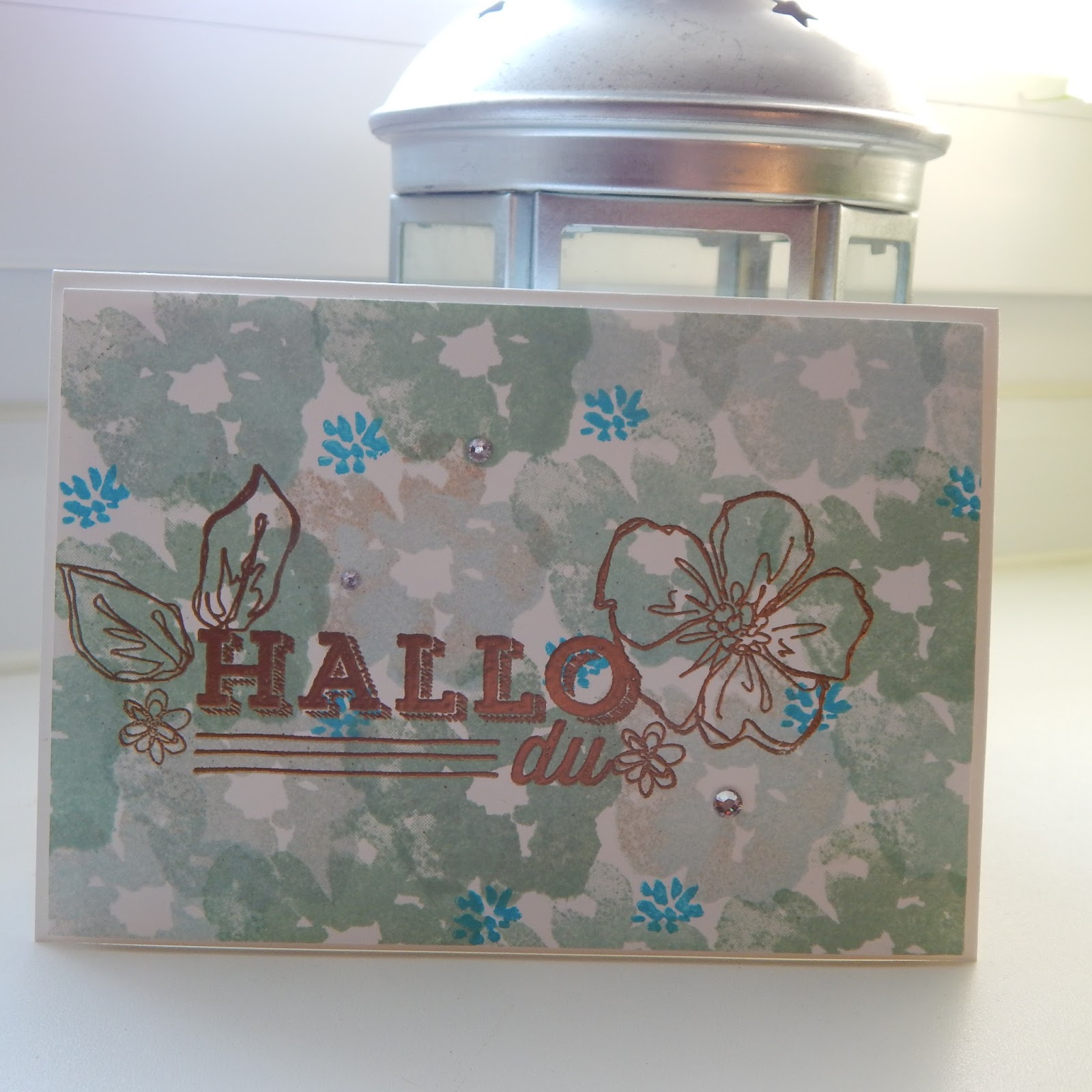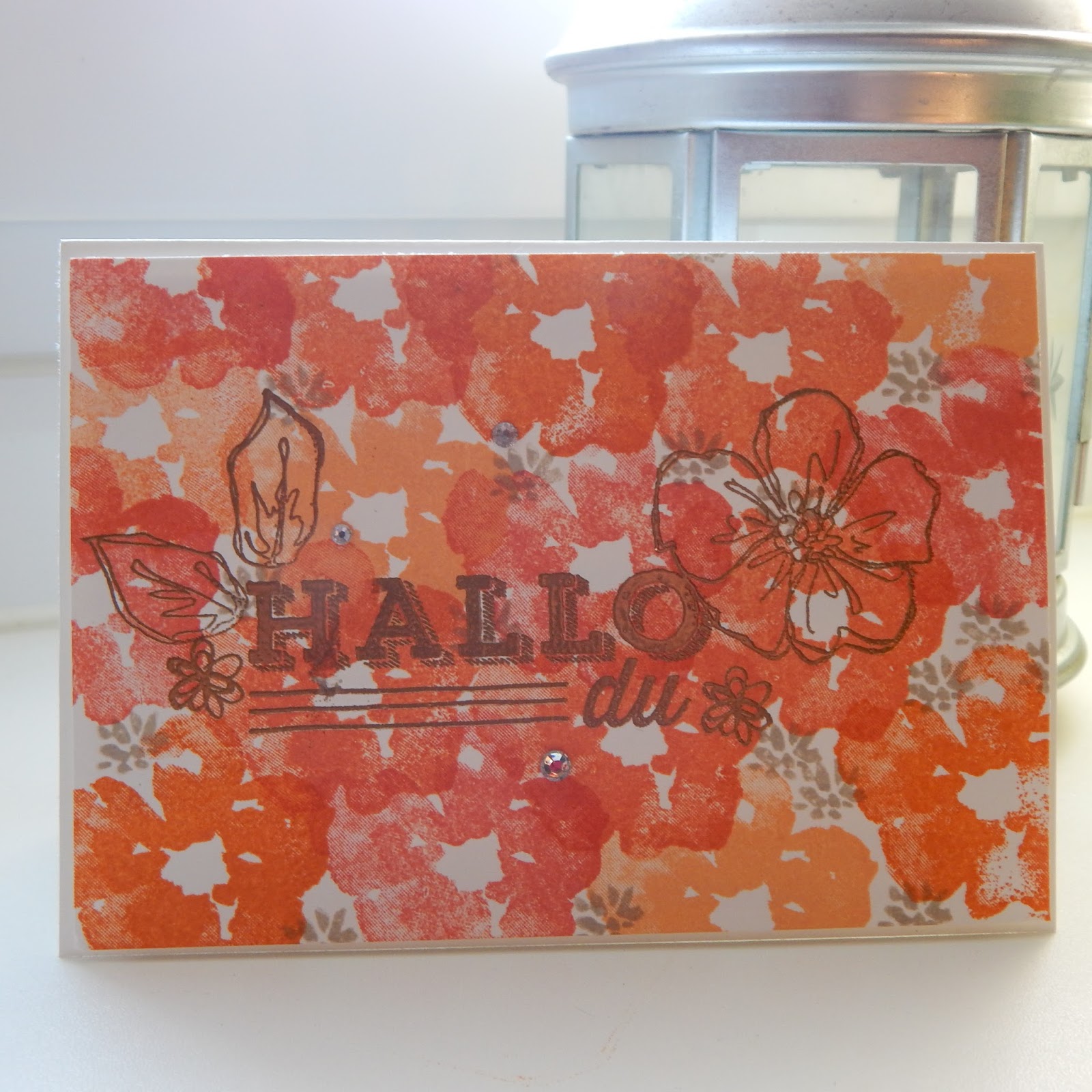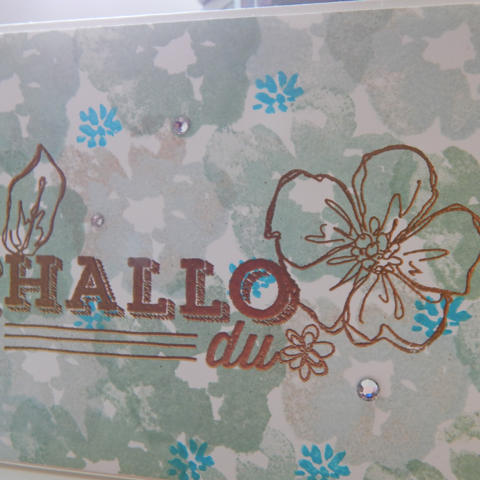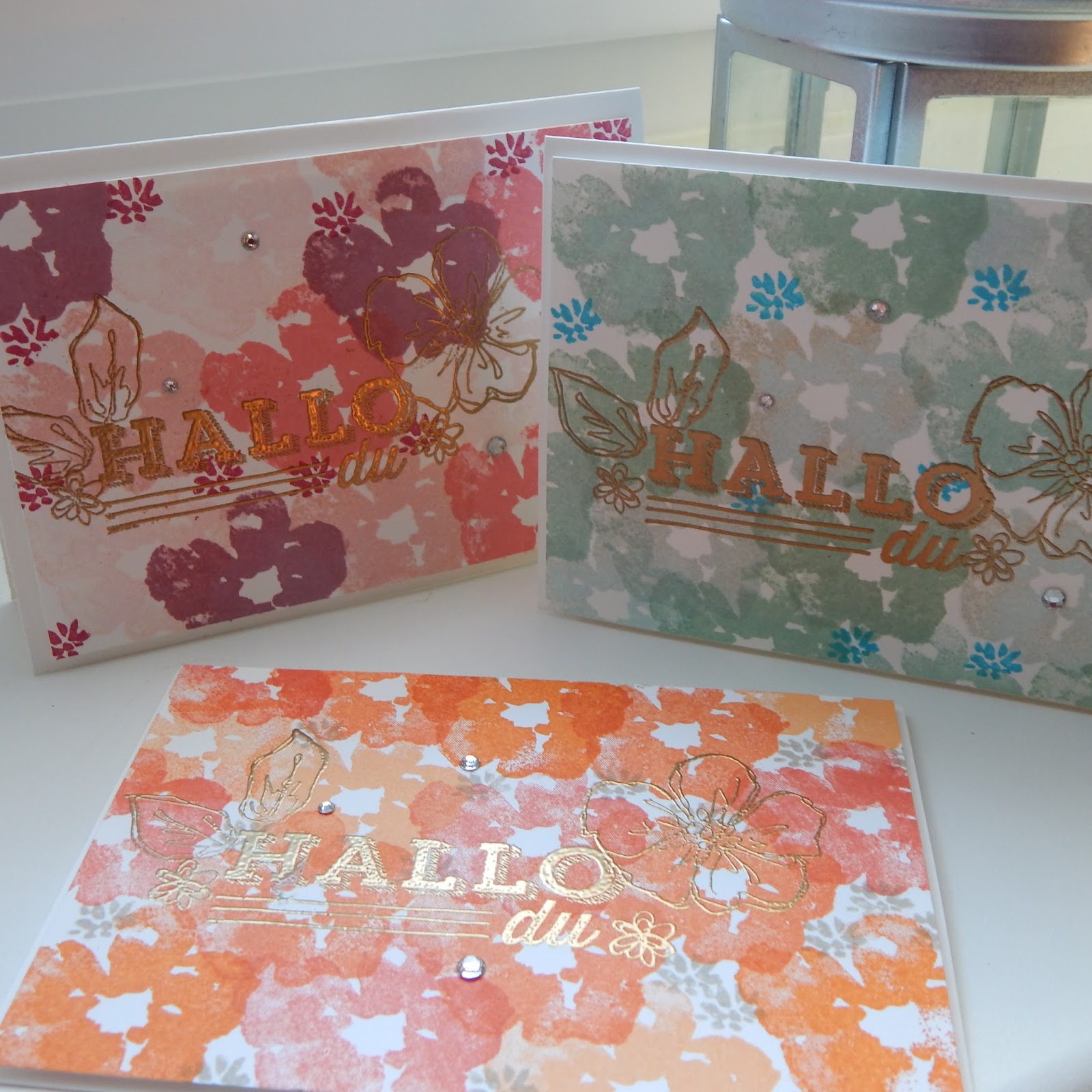 Du nimmst dir einen flächigen Blütenstempel, bei mir ist es aus dem Set “Penned & Painted”, stempelst ihn in vier ähnlichen Farben flächig auf. Dann einen Spruch in Gold embossen.