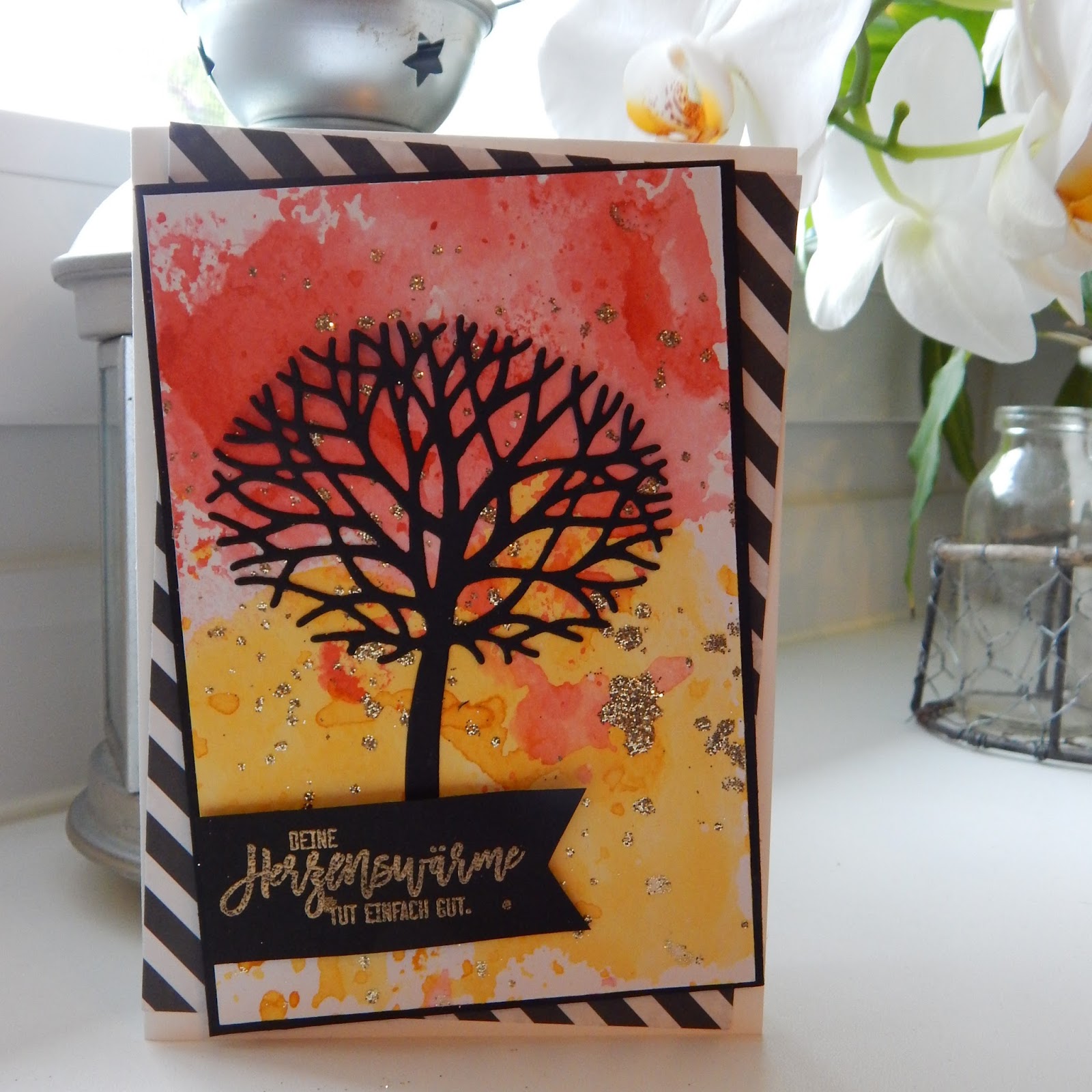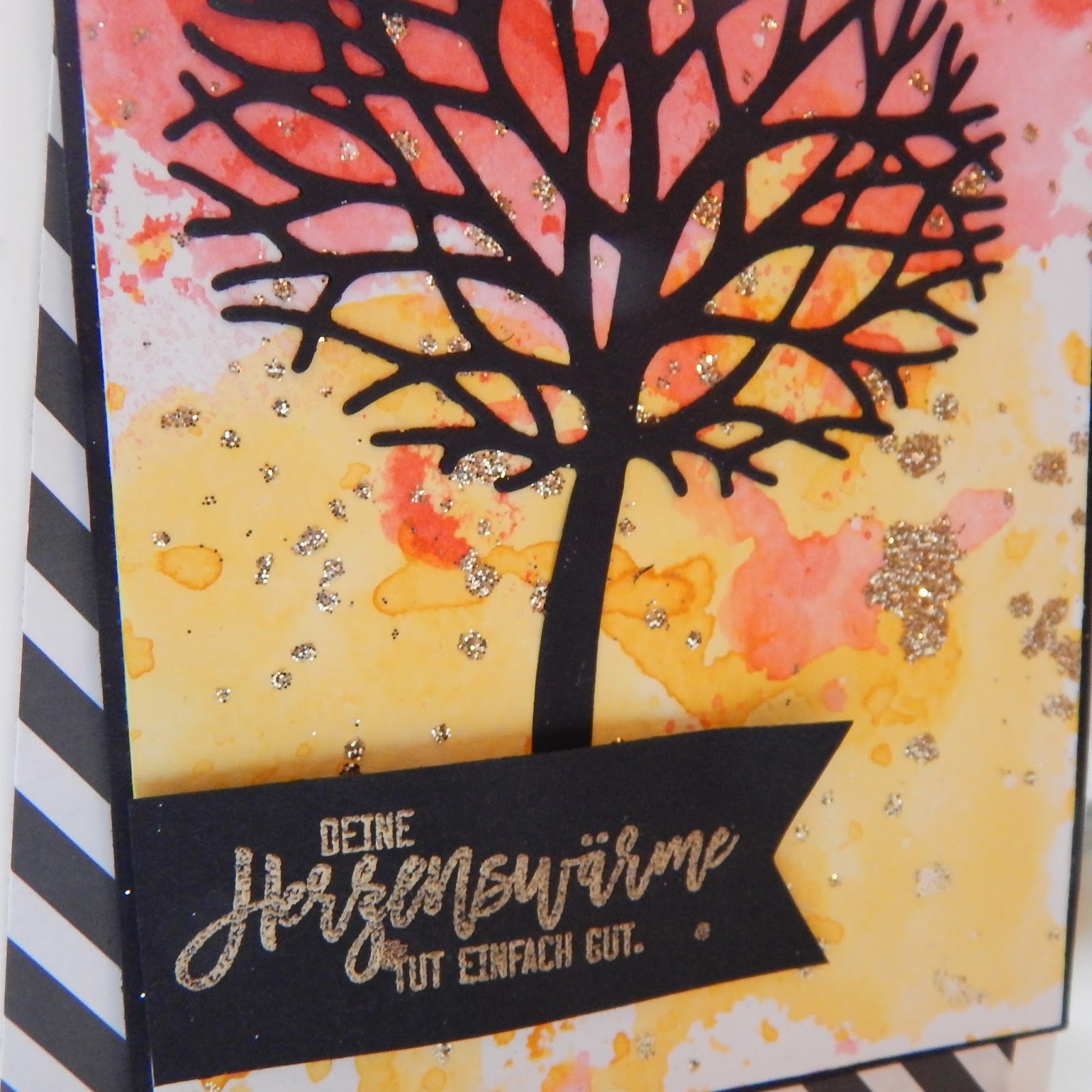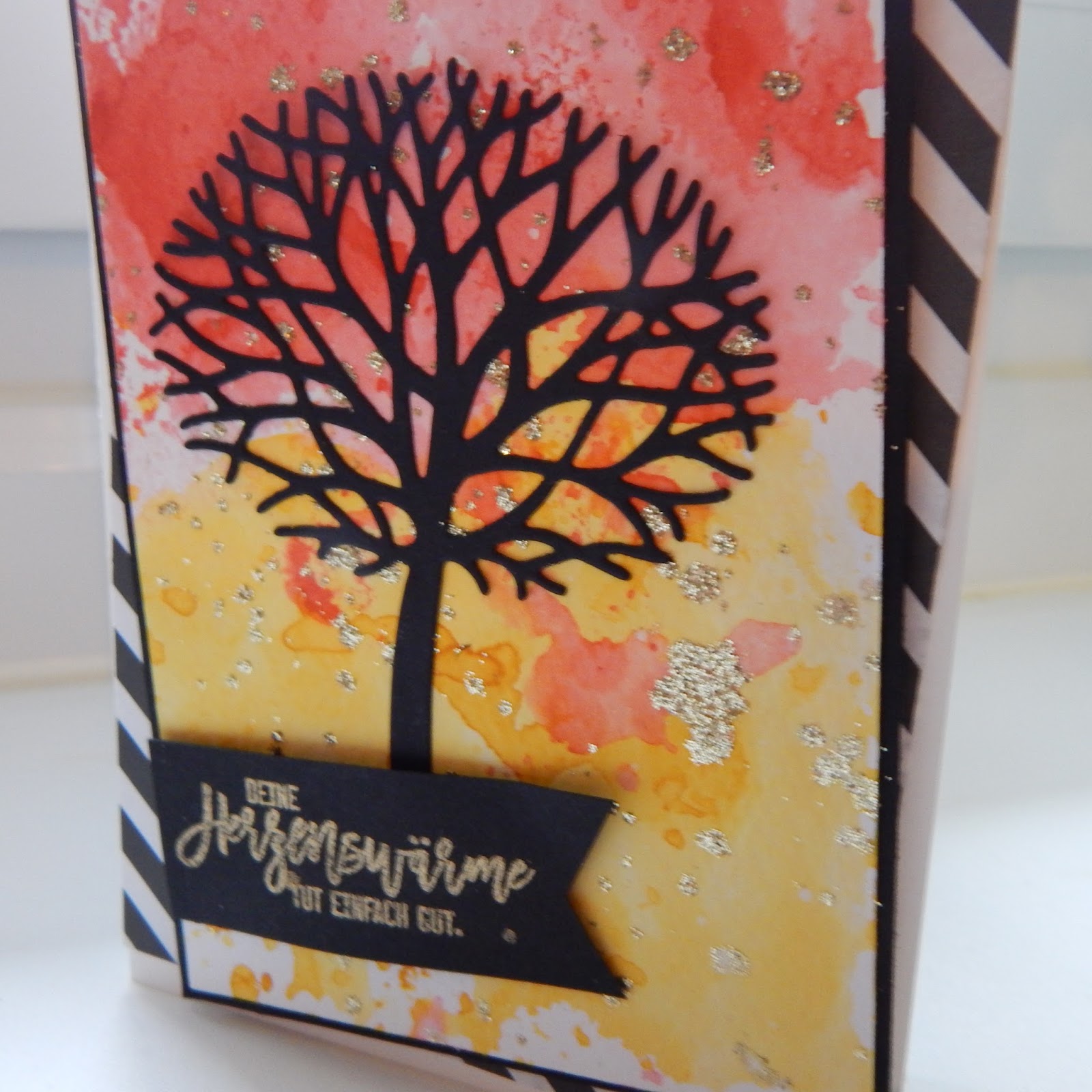 Heute zeige ich dir eine Karte, deren Hintergrund ich in Aquarelltechnik gestaltet habe. Mit etwas Glitter aufpeppen, den Baum ausstanzen und aufkleben. Der Spruch ist in Gold embosst.