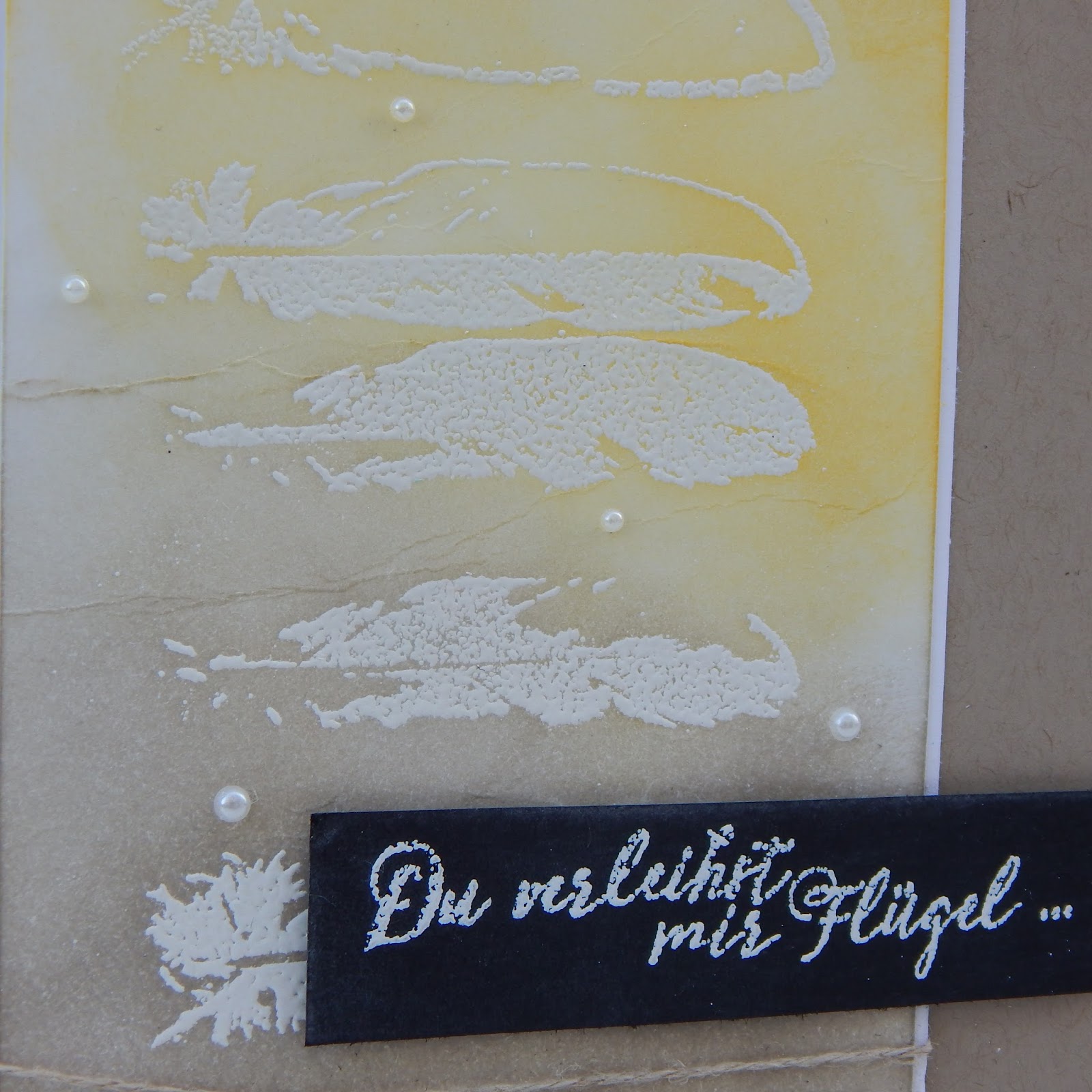 Die Federn habe ich in weiß embosst und dann den Karton mit Farbe und Schwamm eingefärbt. Die Farben sind Savanne, Currygelb und Flüsterweiß.