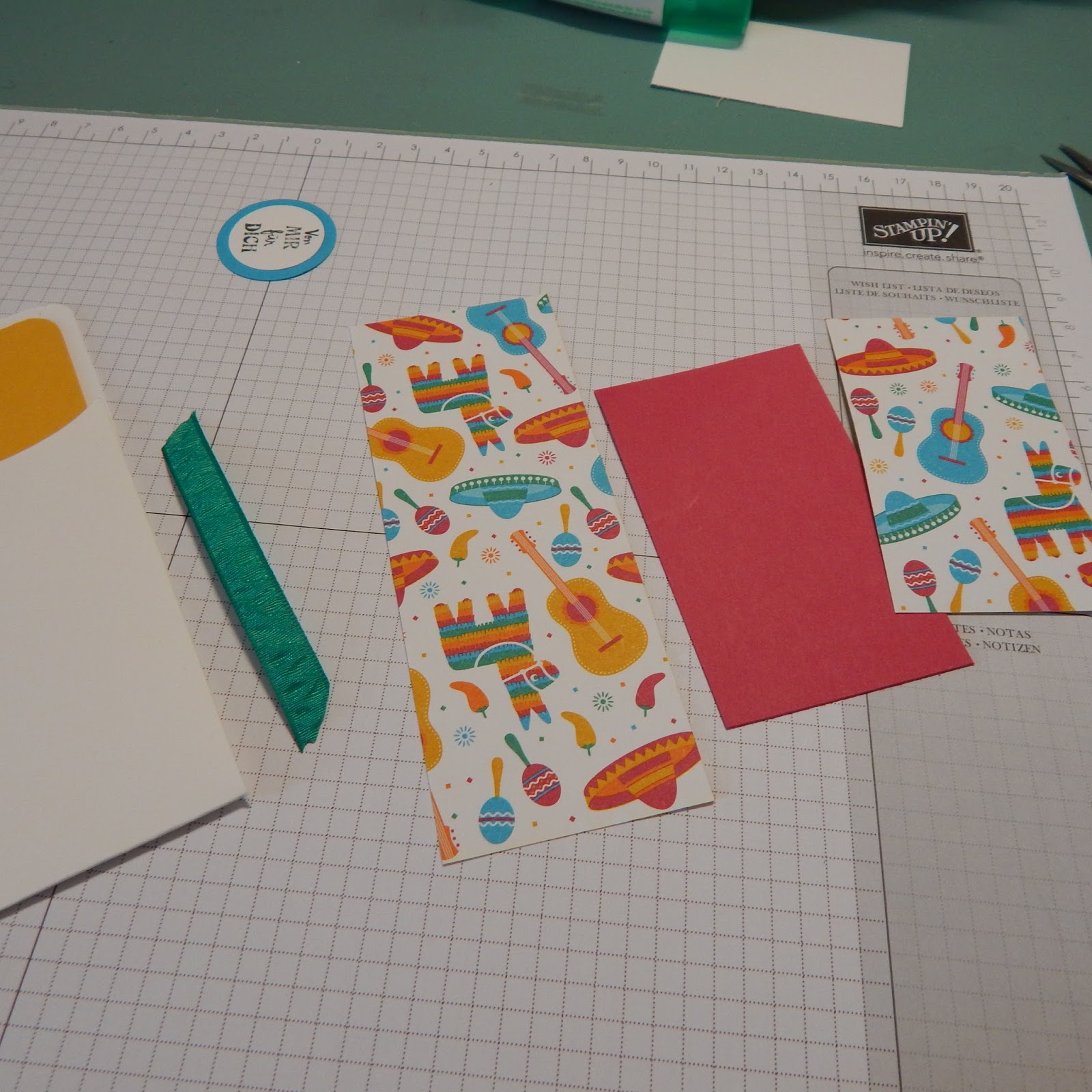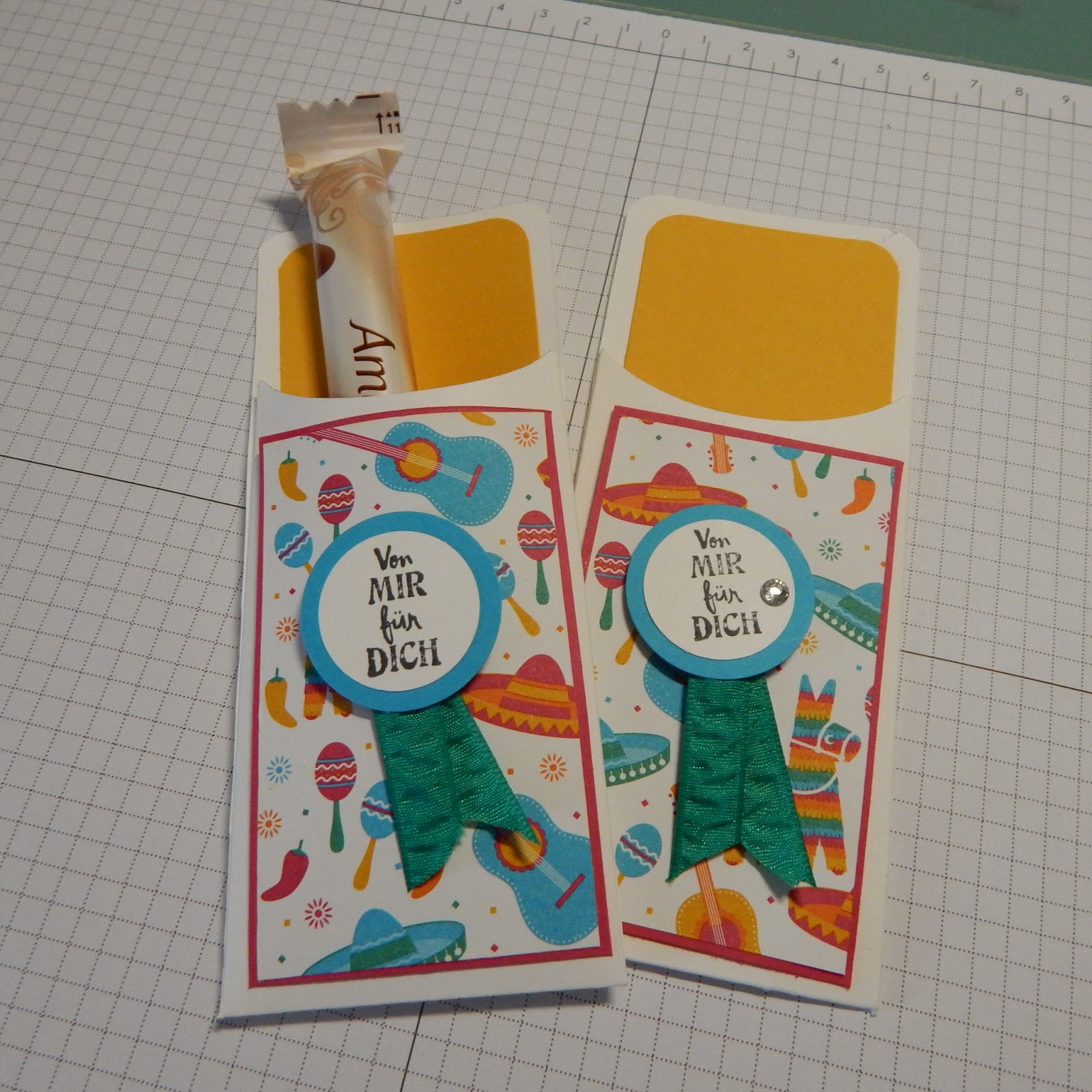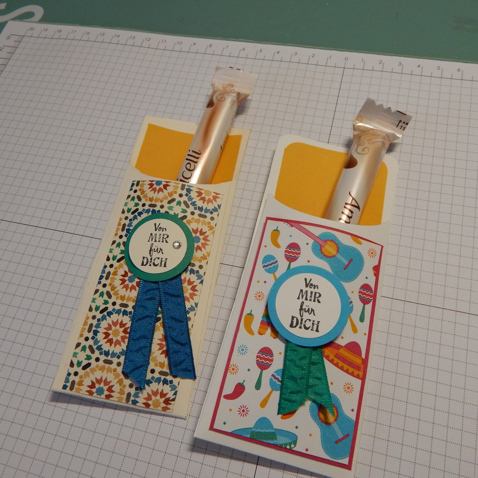 Ich habe die Rückseite auch mit Designpapier beklebt, Maße 5 x 13,5cm. Die Forderseite ebenso, Maße 5 x 8,5cm. Ein Spruch stempeln, mit den Kreisstanzen, zusammenkleben und zusammen mit dem Band verzieren.