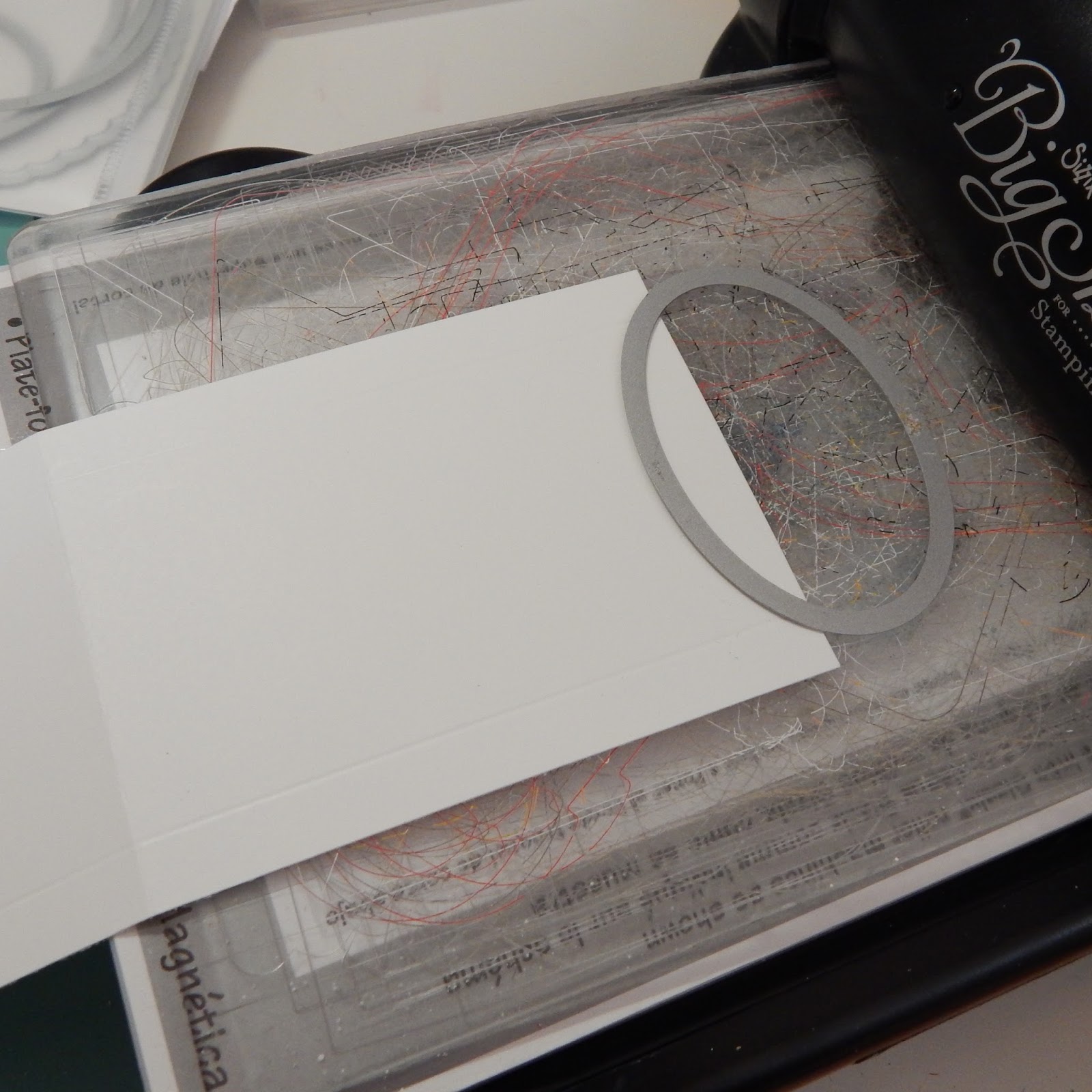 Dann legst du an dem kürzerem Stück, an der kurzen Seite, das ovale Framelit an und stanzt ein Halboval mit der BigShot aus.