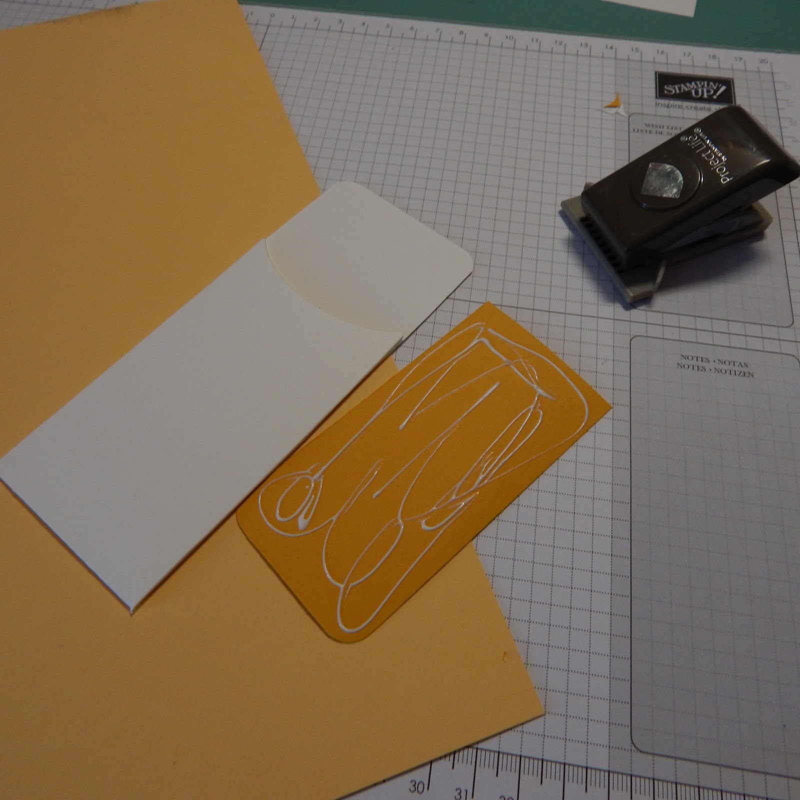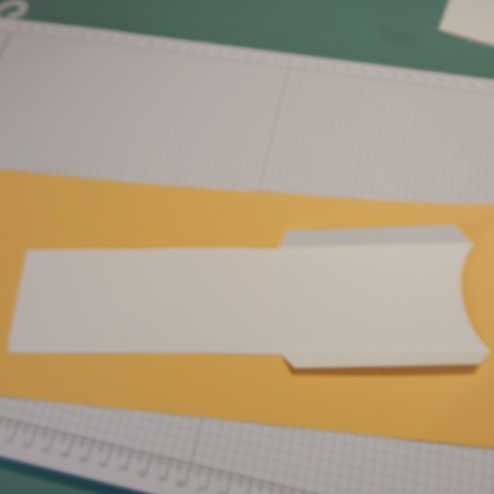 Die Ecken am oberen Stück kannst du mit Eckenstanze abrunden, wenn du möchtest. Die schmallen Seitenteile sind die Klebelaschen.. Die Tasche zukleben . Ein Stück farbigen Karton in 5 x 10cm in die Tache kleben.