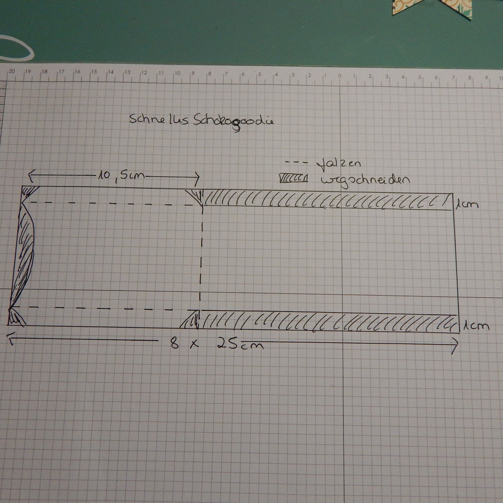 dann auf der langen Seite bei 10,5cm falzen und an der kurzen Seite, auf jeder Seite bei 1cm falzen.