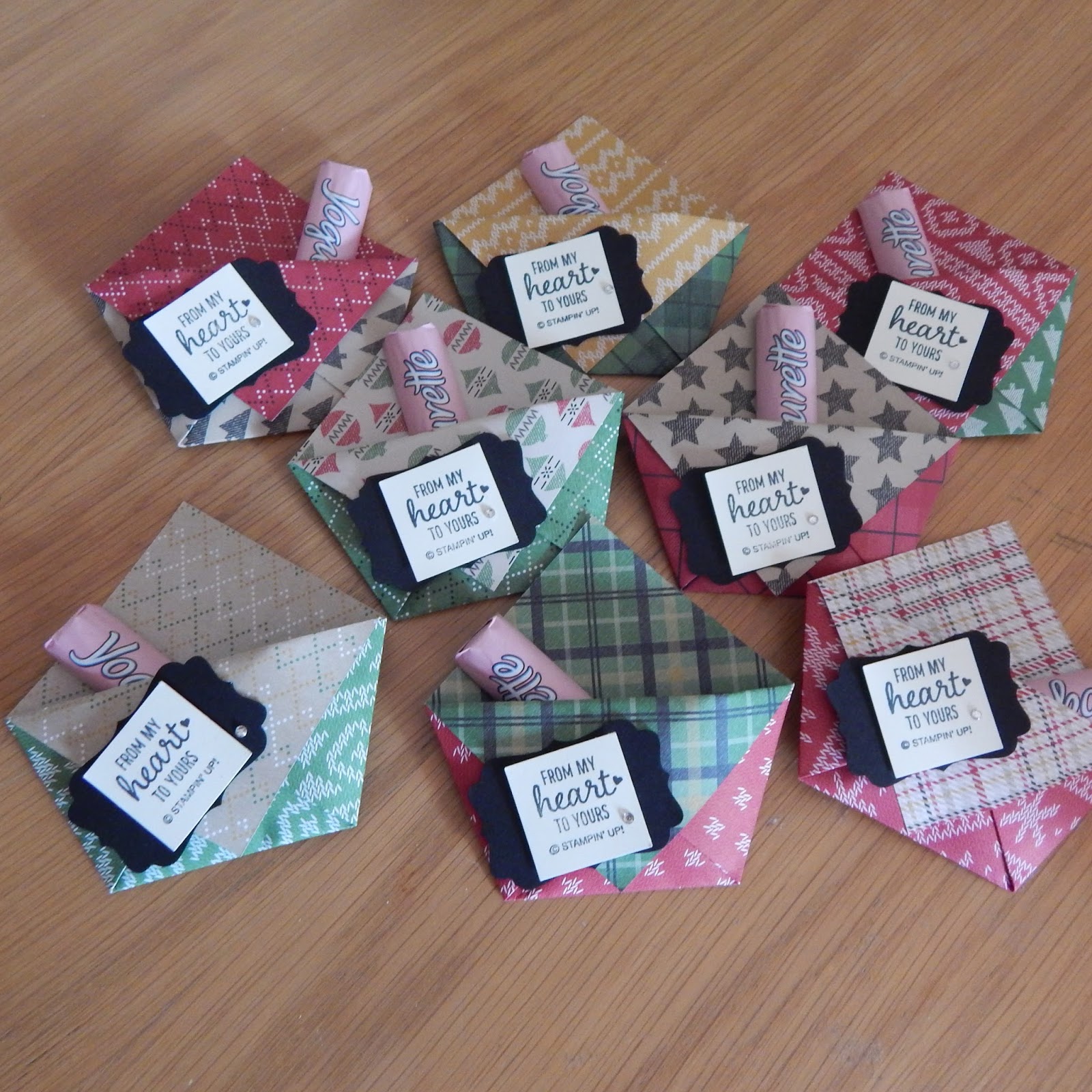 Für die Goodies habe ich mit dem Designpapier im Block Gemütliche Weihnachten gewerkelt. Es hat gleich die richtige Größe von 6×6 inch (15,2×15,2cm). Etwas Deko und Schoki und fertig ist das Goodie!