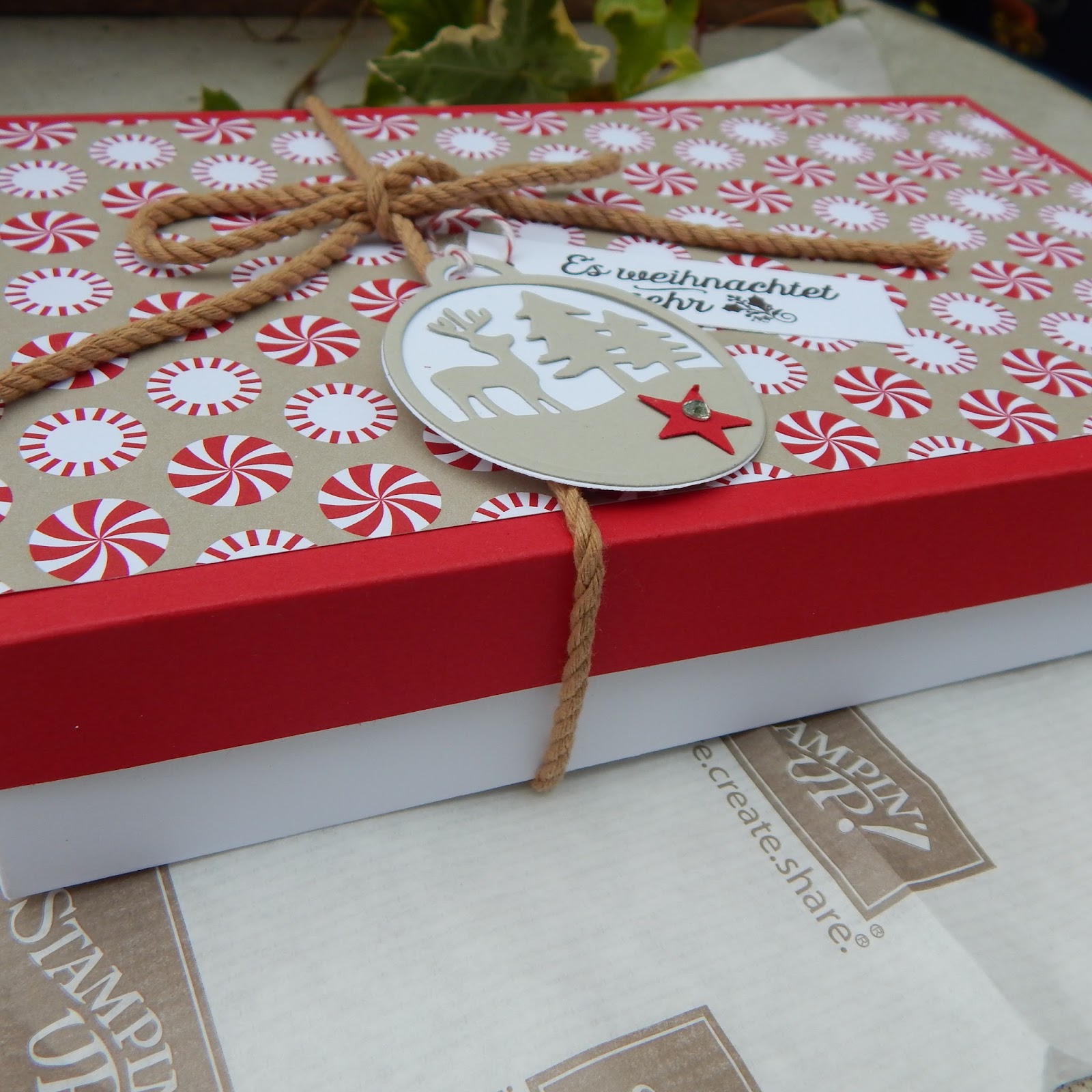 So langsam gehtht es kreativ Richtung Weihnachten. Da muß Frau sich die ersten Gedanken machen. Und das habe ich heute reichlich, denn ich habe Donnerstag einen Workshop mit den Damen aus meiner Gemeinde. Die katholischen Frauen von Nachrodt-Wiblingwerde möchten Verpackungen für Trüffel und Pralinen, die werden nämlich in einem extra Workshop mit einem Conditor hergestellt, mit mir werkeln. Da habe ich drei verschiedene Varianten vorbereitet und eine davon, ist die Geschenkschachtel. Da passen schon einige Pralinen rein!