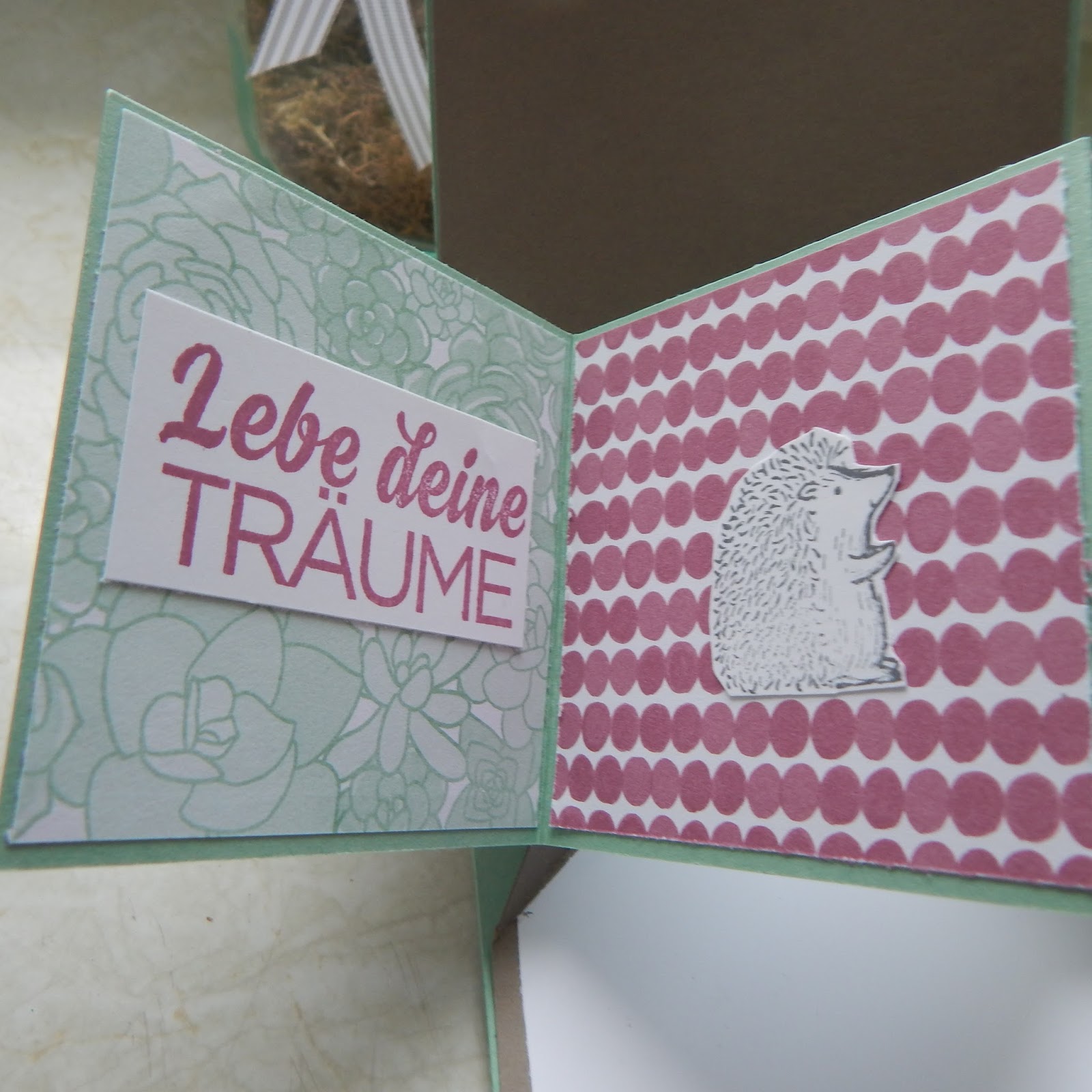 Und der süße Elefant aus dem Stempelset Love you lots passt hervorragend. Aber auch sein Kumpel Igel fehlt nicht und ist im Inneren verborgen.