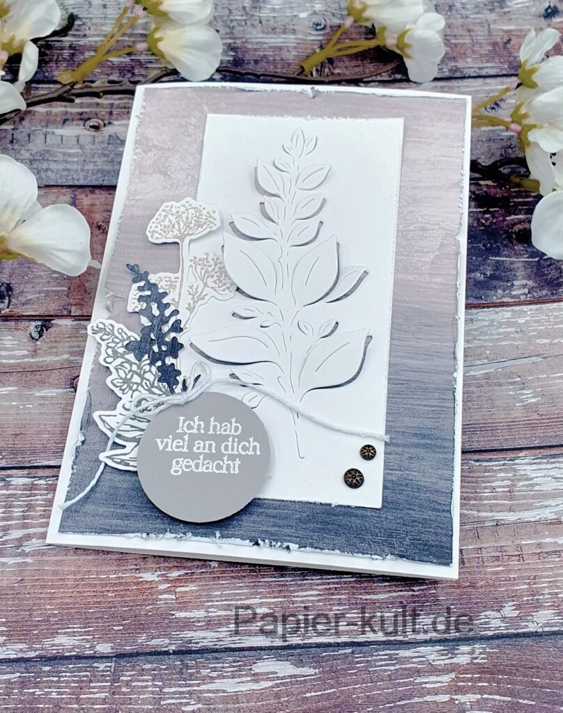 Für den Hintergrund meiner Karte habe ich Designpapier benutzt. Die Kanten angeraut, darüber ein Pflanzenstanzteil in Weiß, Blüten gestempelt und ausgestanzt, dazu gegeben, den Spruch in Weiß heiß embosst auf Granitfarbigen Kreis, zum Schluß natürlich noch passende Accecoires.