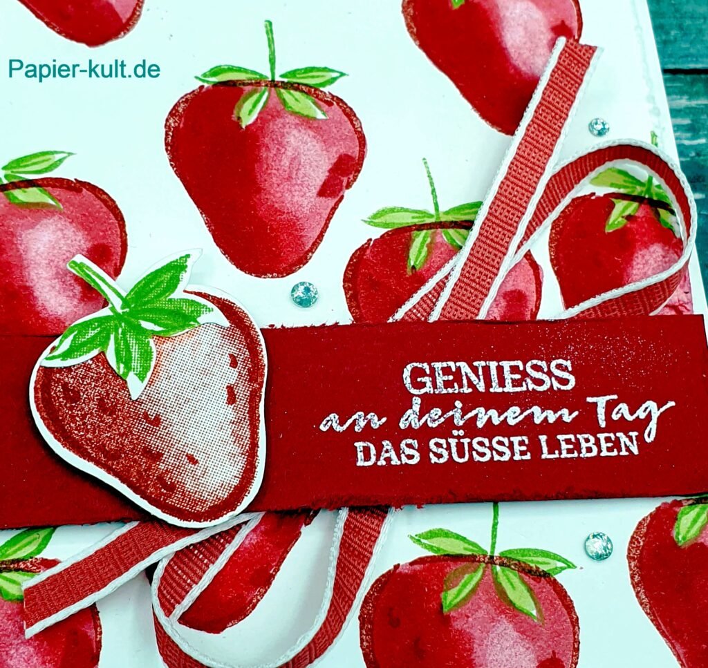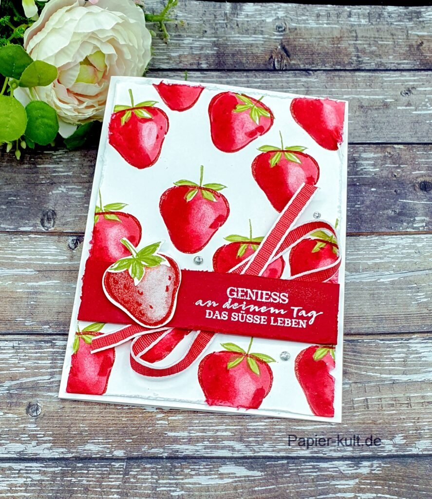Neuer Monat und somit neuer Blog Hop von Stampi@first zum Erdbeerliebe. Das hat sich Steffi für diesen Monat gewünscht. Ich liebe Erdbeeren! Aber es hat mich trotzdem vor einige Herausforderungen gestellt! Eigentlich wollte ich eine 3D Erdeere basteln. Was soll ich sagen, es sah so schlecht aus, das ich mir etwas neues Überlegen musste. Also habe ich das alte Produktpaket Beerenstark benutzt. Leider ist das bei SU nicht mehr zu bekommen, aber ich habe keine aktuellen Erdbeermotive. Gut das Frau viel aufbewahrt!