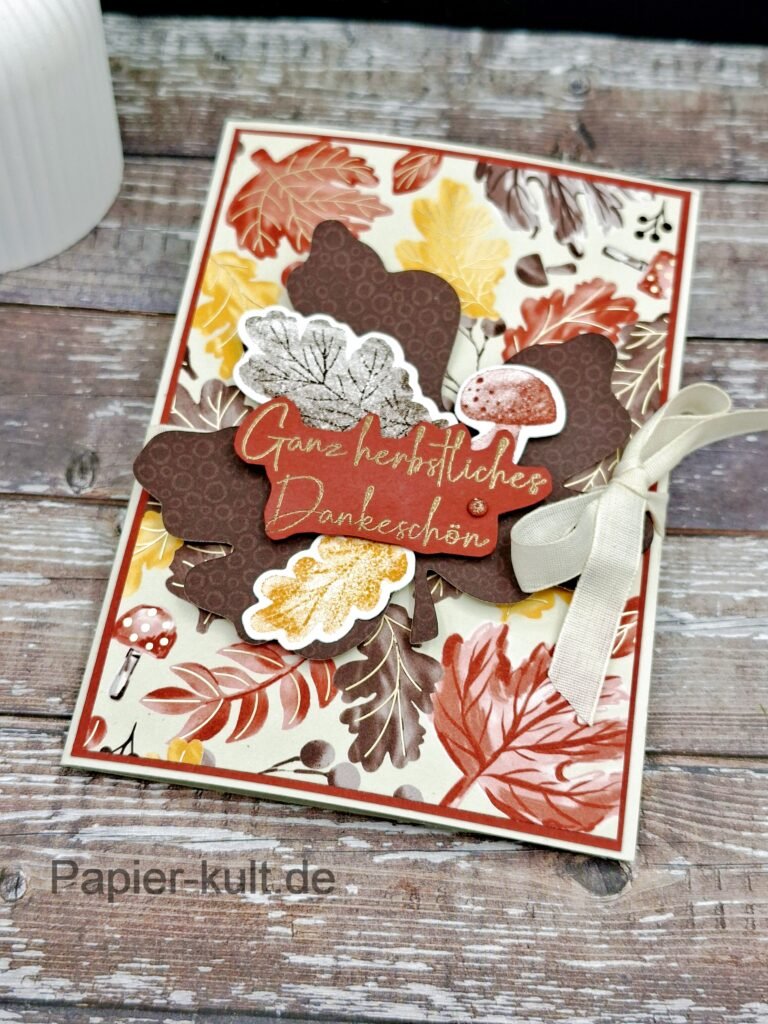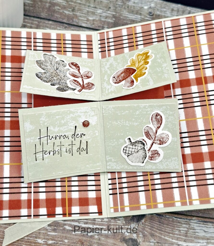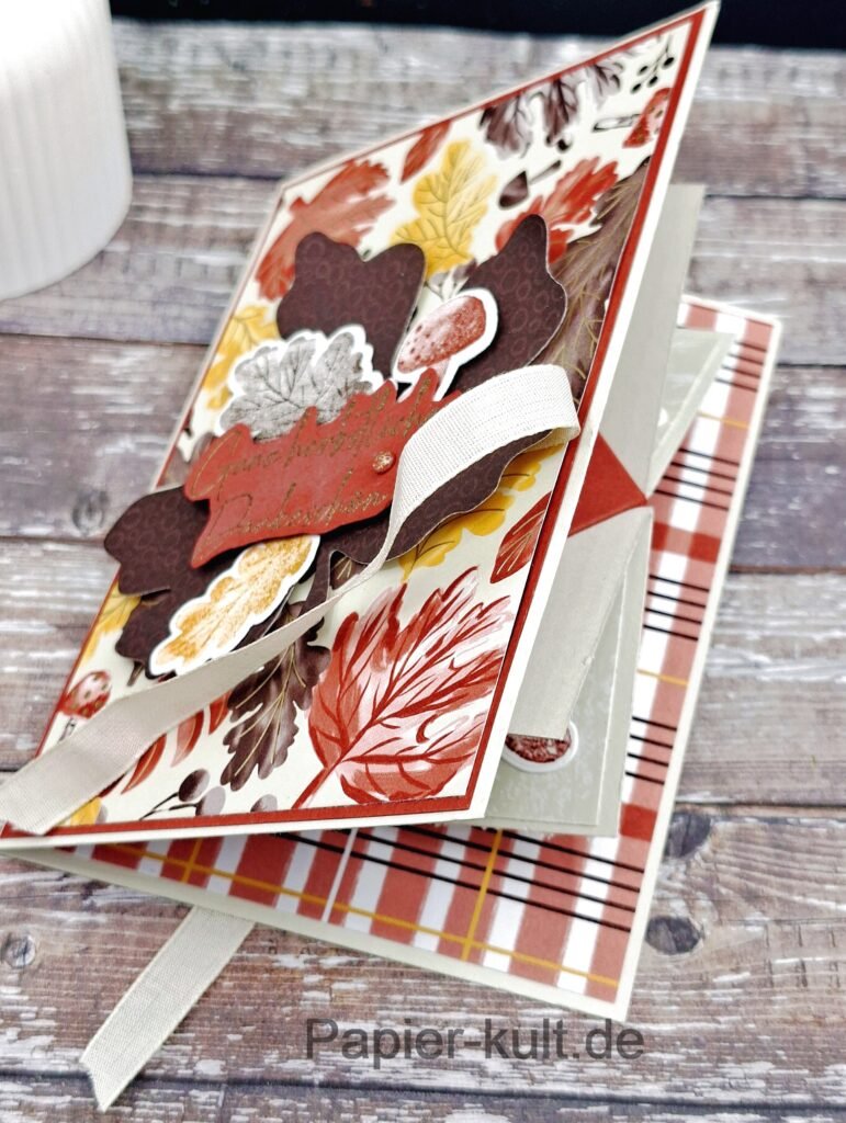 Pop-Up Karten haben ja immer einen schönen WOW – Effekt, in welcher Form auch immer. Bei meiner Form öffnet sich durch ein Mechanismus das Innenleben. Gestaltet mit der Exclusiv Online Produktreihe Wunderbarer Herbst.