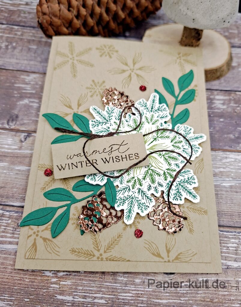 Grundkarte und Aufleger in Savanne und Ton in Ton mit Sternenen bestempelt. Die Sterne in verschiedenen Grüntönen gestempelt und ausgestanzt. Übereinander gelagert. Die Zapfen in Gold ausgestanzt.