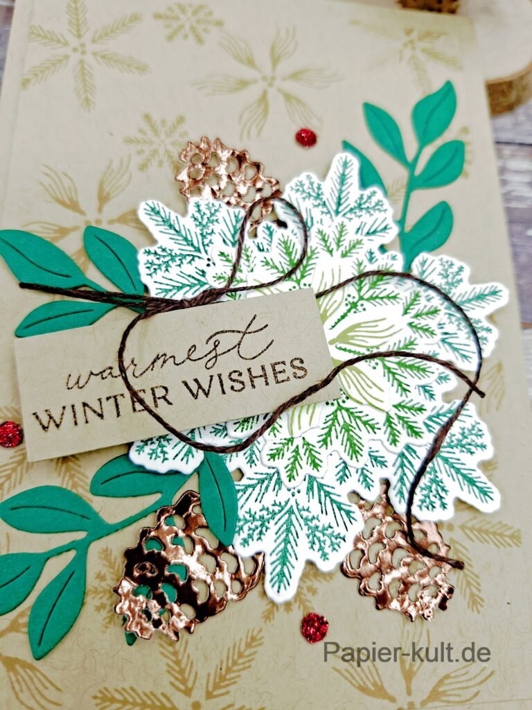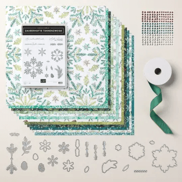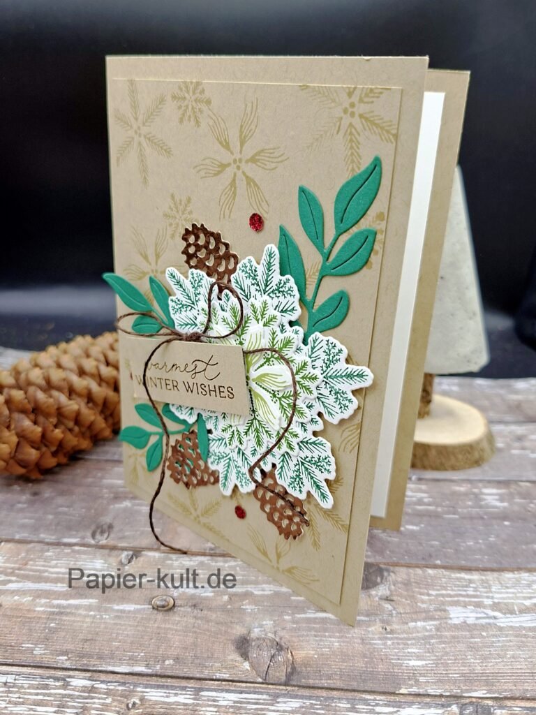 Ich habe mit der Produktreihe “Elegante Tannen & Flocken”eine Weihnachtskarte gewerkelt. Sie war auch gleichzeitig mein Tauschswap beim Teamtreffen. In gehalten in Natur – und Grüntönen ist das genau mein Ding.