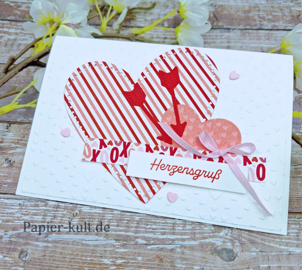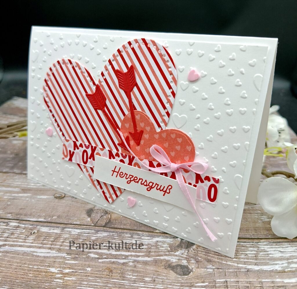 Wie wäre es mit einer neuen Kartenidee? Valentin ist ja nicht mehr lang hin und vielleicht möchtet ihr euren Lieben oder einem lieben Menschen ja eine kleine Aufmerksamkeit schenken. Da ist eine Karte doch immer eine gute Idee, besonders eine selbstgemachte Karte! Da kommt die neue Produktreihe “Auf die Liebe!” gerade richtig.