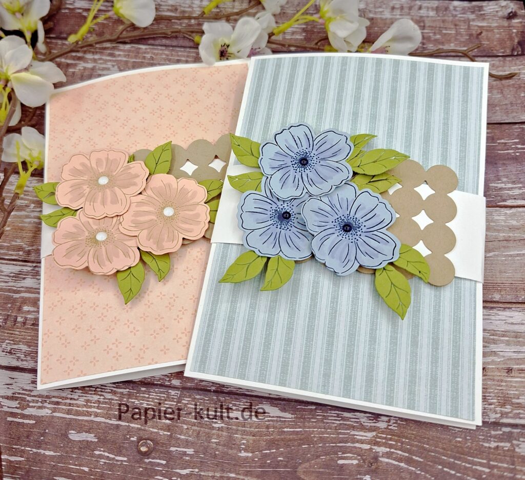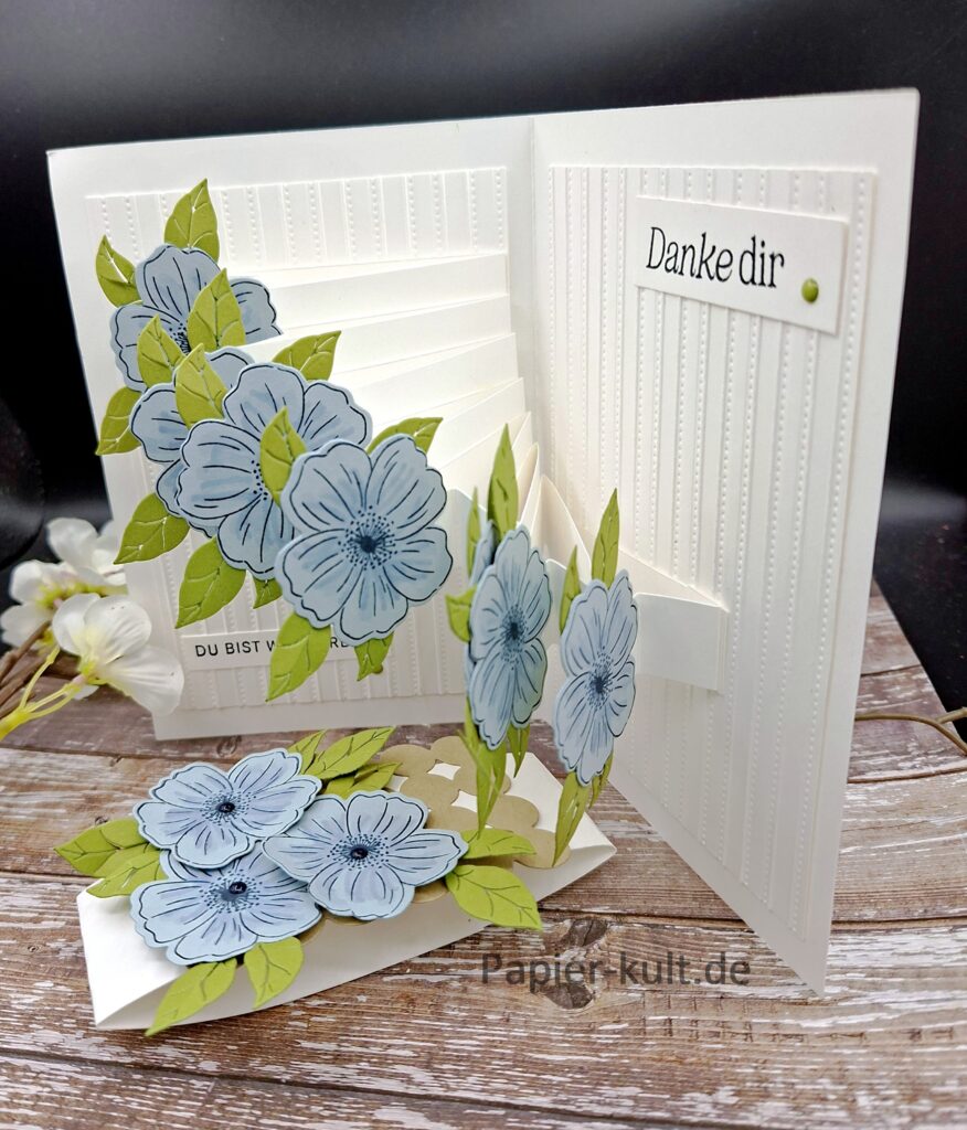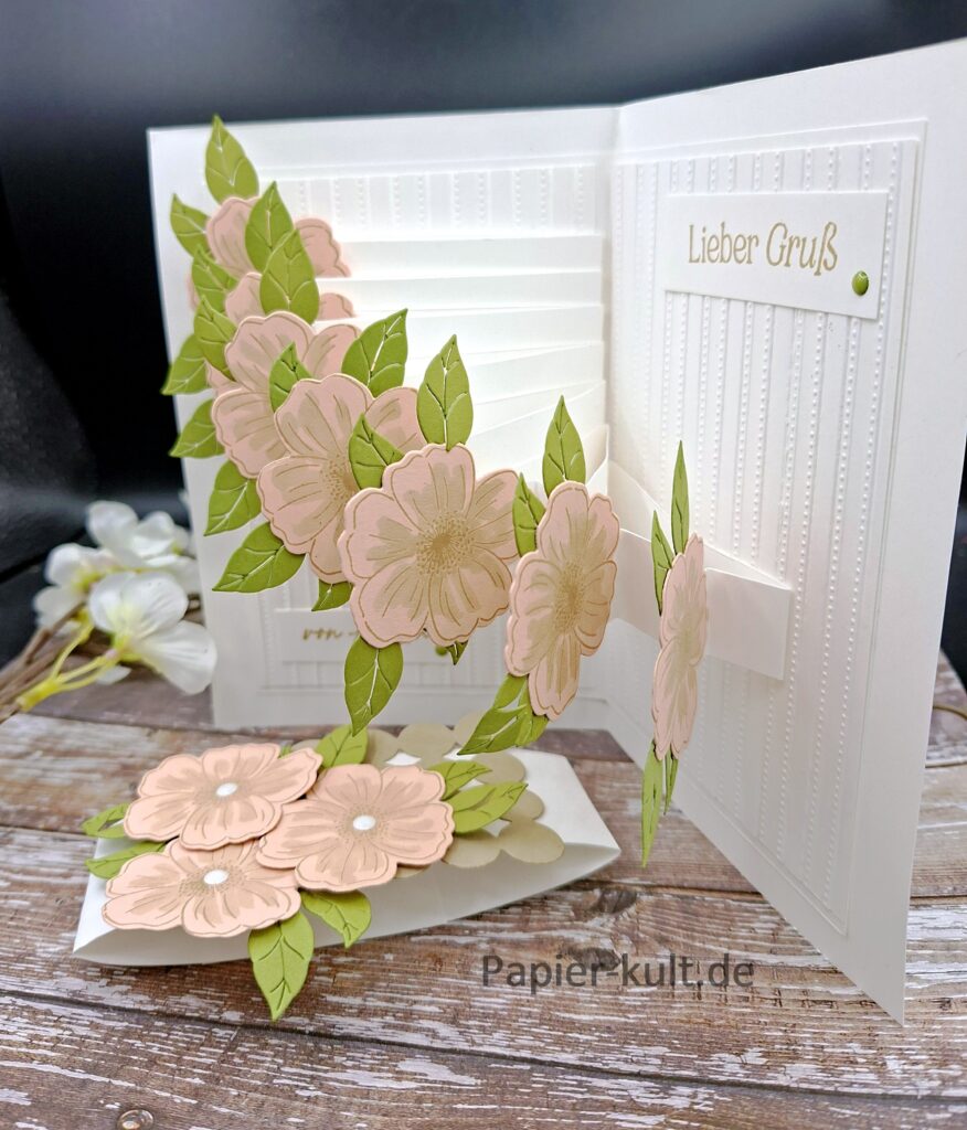 Ich habe einer Wasserfall Pop Up Karte gestaltet. Mit der Exklusiv Online Produktreihe “Liebevolle Blüten”.