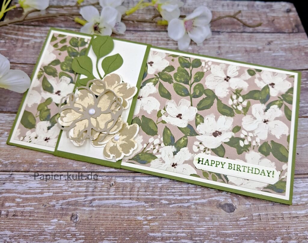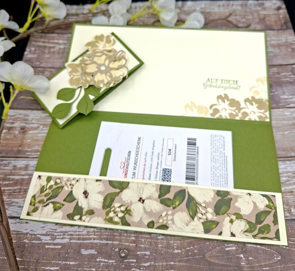 Ich liebe ja die Produktreihe “Gemalte Schönheiten” und ihr habt schon einiges Gewerkeltes damit von mir gesehen. Jetzt ist es in der Auslaufliste und ich wollte euch noch einmal Geschmack machen. Wer es etwas Romantisch, Nostalgisch und Blumen mag, ist mit dieser Reihe gut beraten. Ich habe zum Geburtstag einer Kollegin eine Gutscheinkarte benötigt. Dazu habe ich eine Klappkarte mit Gutscheinfach gewerkelt.