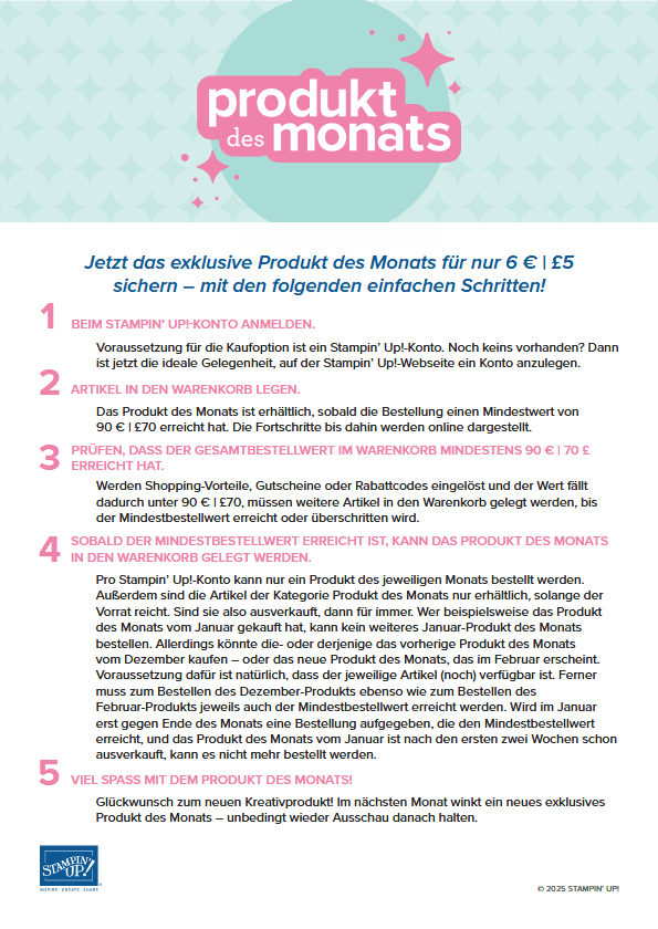 Jeden Monat gibt es ein neues exclusives Produkt. Welches nur begrenzt zur Verfügung steht. Bei einer qualifizierten Bestellung, ab 90€, kann dieses Produkt für 6€ erworben werden.